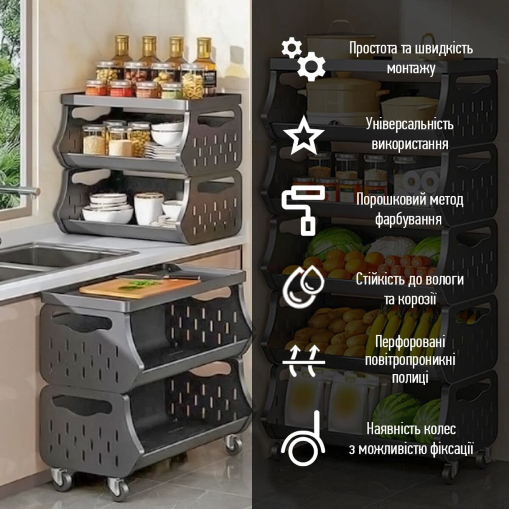 Боковые панели имеют перфорацию, что способствует вентиляции, например, продуктов питания или текстиля. Колеса изготовлены из прочного полимера, что обеспечивает легкость перемещения стеллажа без царапин на полу.