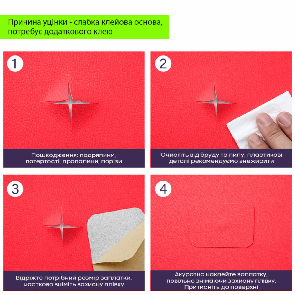 - Материал представлен полосами длиной 1 и 3 м, что позволяет увеличить вариативность размера площади использования: от маленьких, фигурных заплаток до устранения повреждений больших кожаных поверхностей;