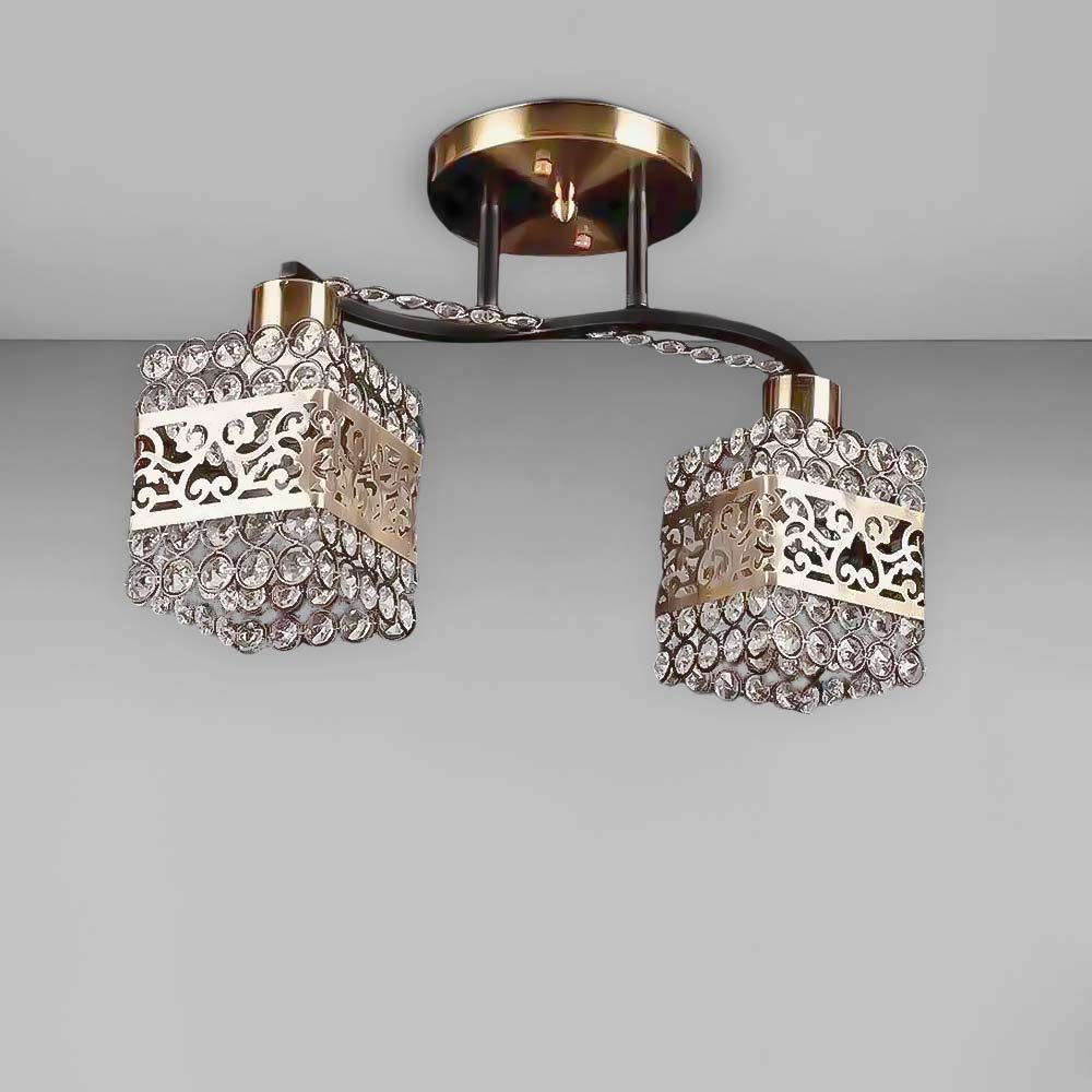 Сучасна стельова люстра на дві лампи, оснащена металевими плафонами прямокутної форми з кришталевими вставками: що забезпечить вишуканий блиск і створить цікаву гру світла та тіні при включеному джерелі світла.Найкраще ця люстра підійде для приміщень із загальною площею 6 м², при використанні лампочок 6 Вт (LED) або 60 Вт (стандартна).