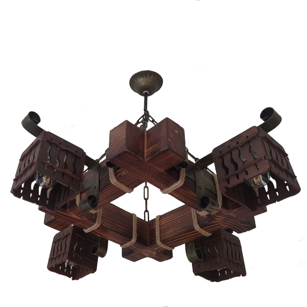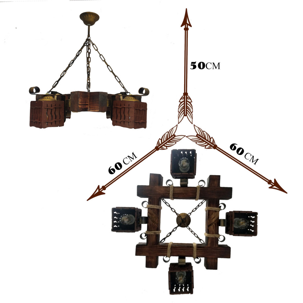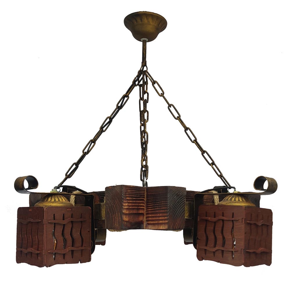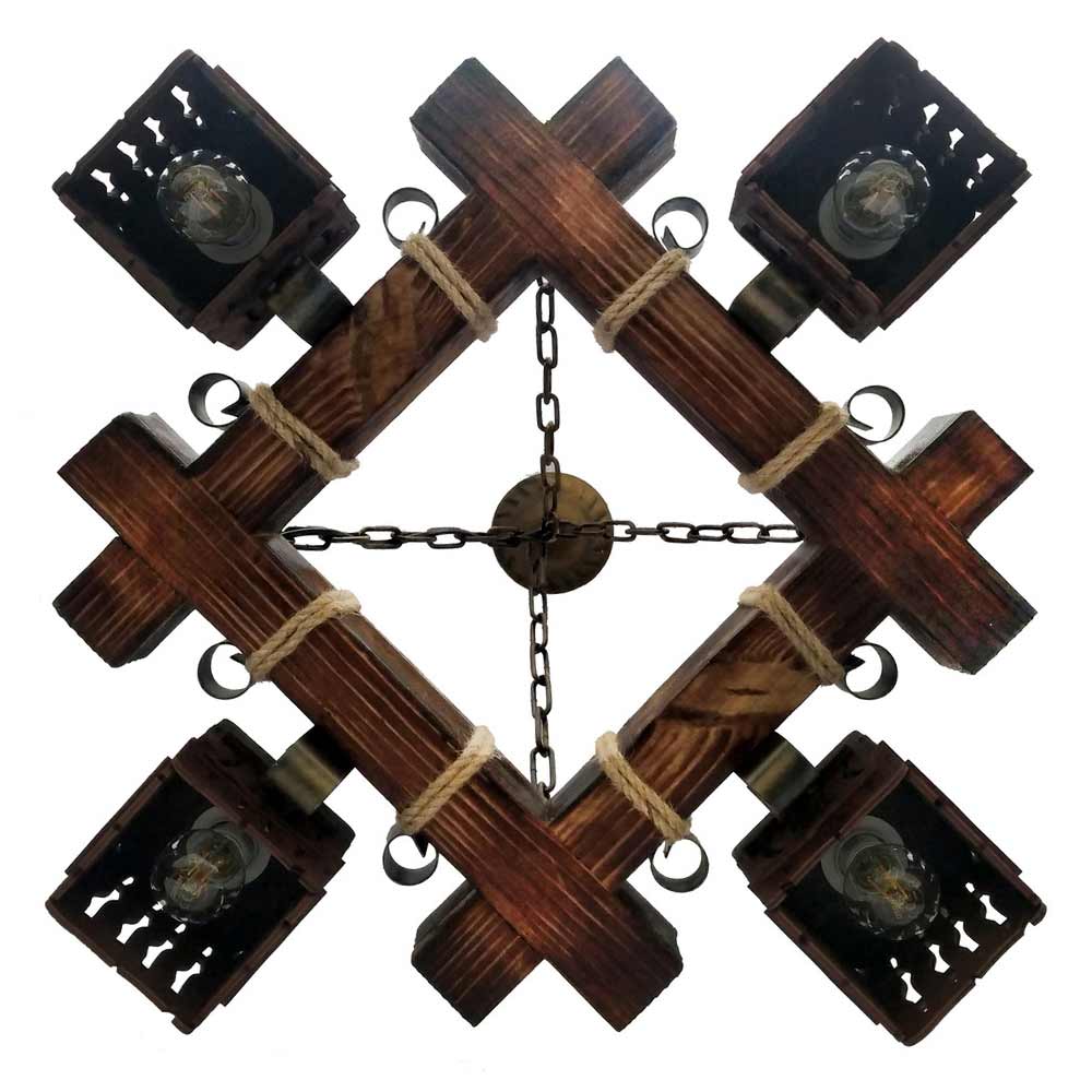 Дерев'яна підвісна люстра в Кантрі стилі на чотири лампи з квадратними плафонами.