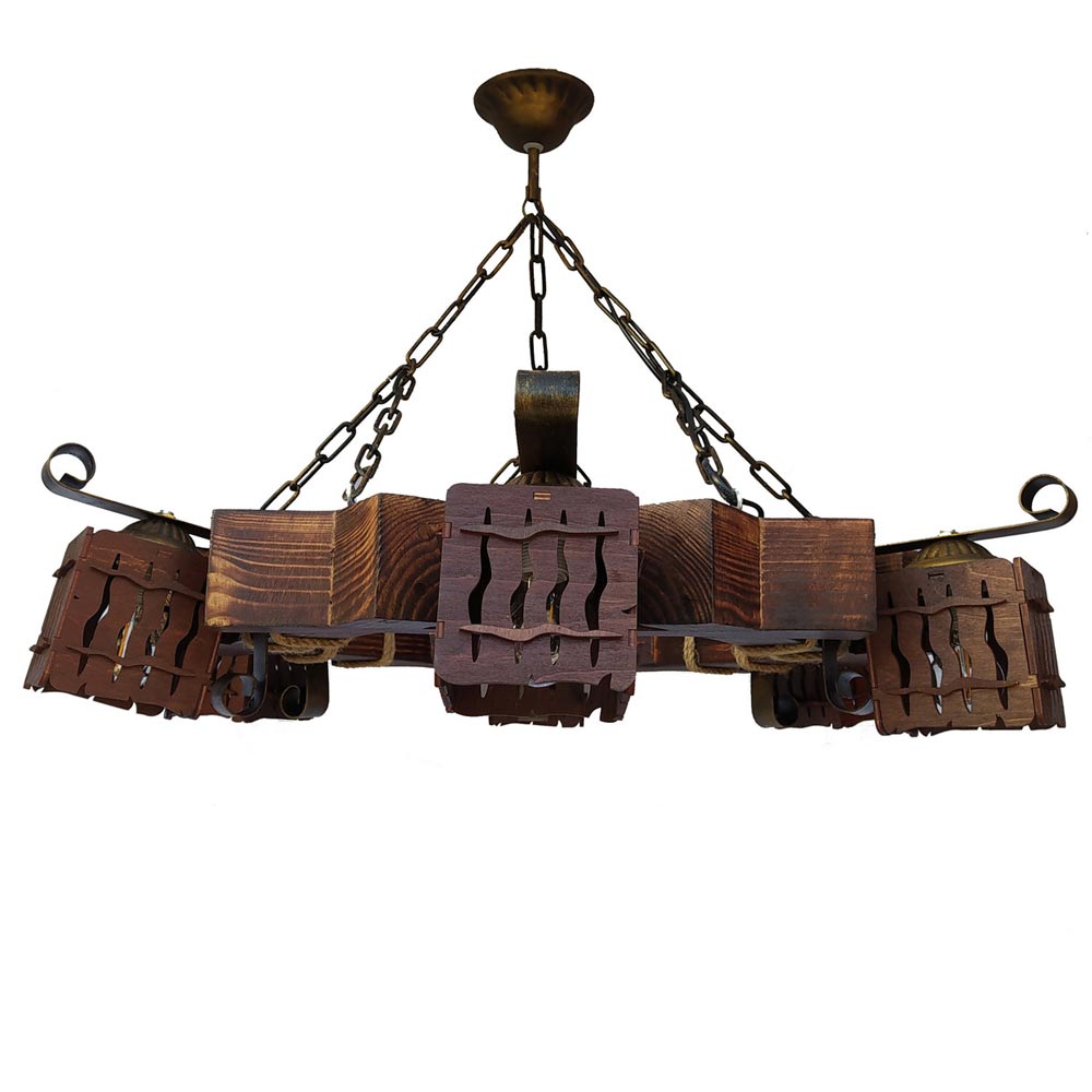 Дерев'яна підвісна люстра в Кантрі стилі на шість ламп з квадратними плафонами.