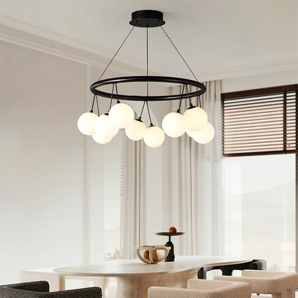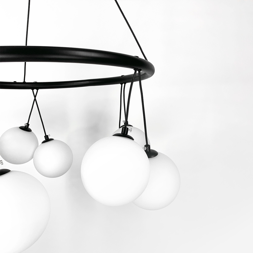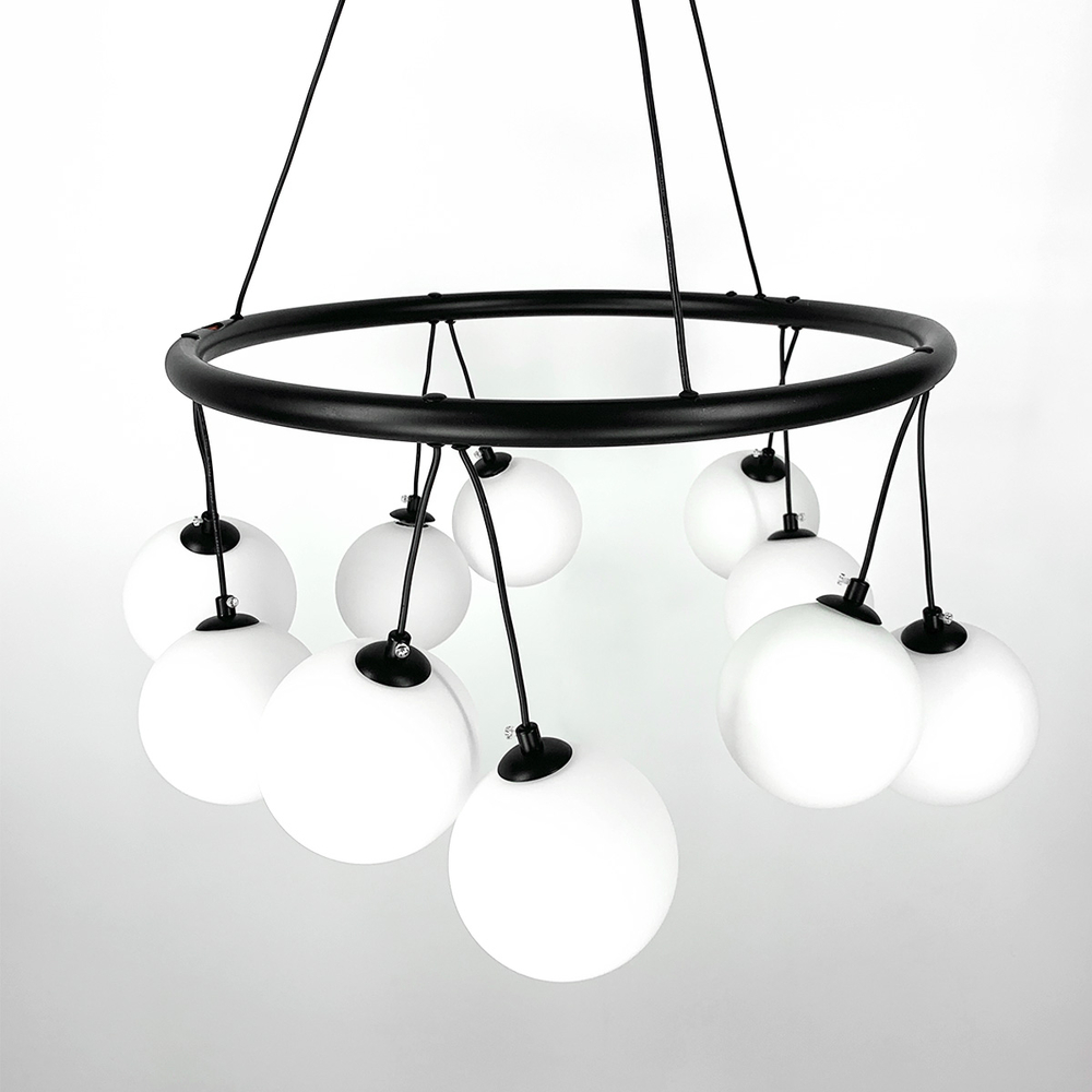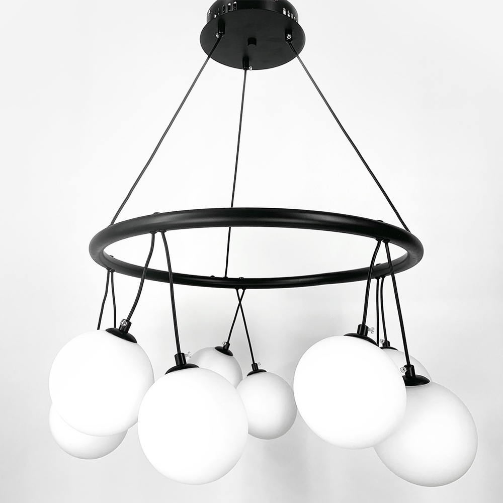 Підвісна люстра-кільце в сучасному стилі в корпусі чорного кольору на десять ламп з білими плафонами у вигляді кулі.Висота люстри регулюється. Діаметр 60 см – 10 плафонів.