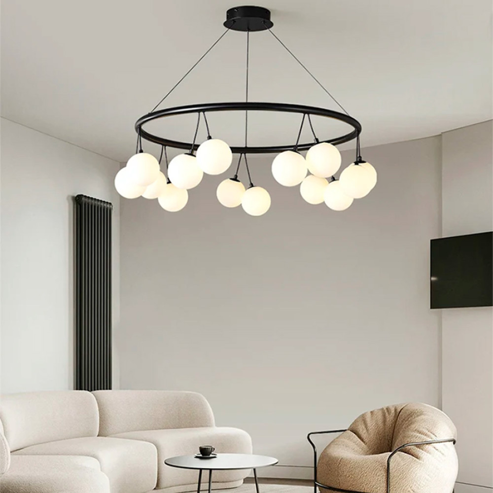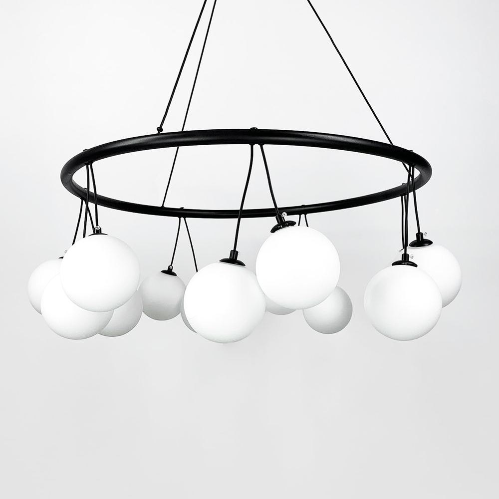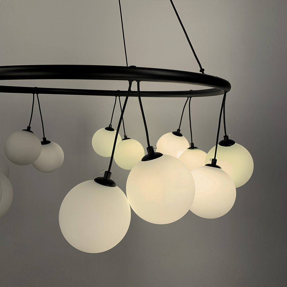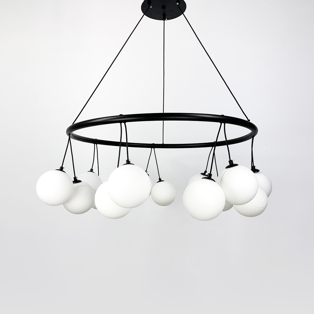 Підвісна люстра-кільце в сучасному стилі в корпусі чорного кольору десять ламп з білими плафонами у вигляді кулі. Висота люстри регулюється. Діаметр 80 см – 14 плафонів.