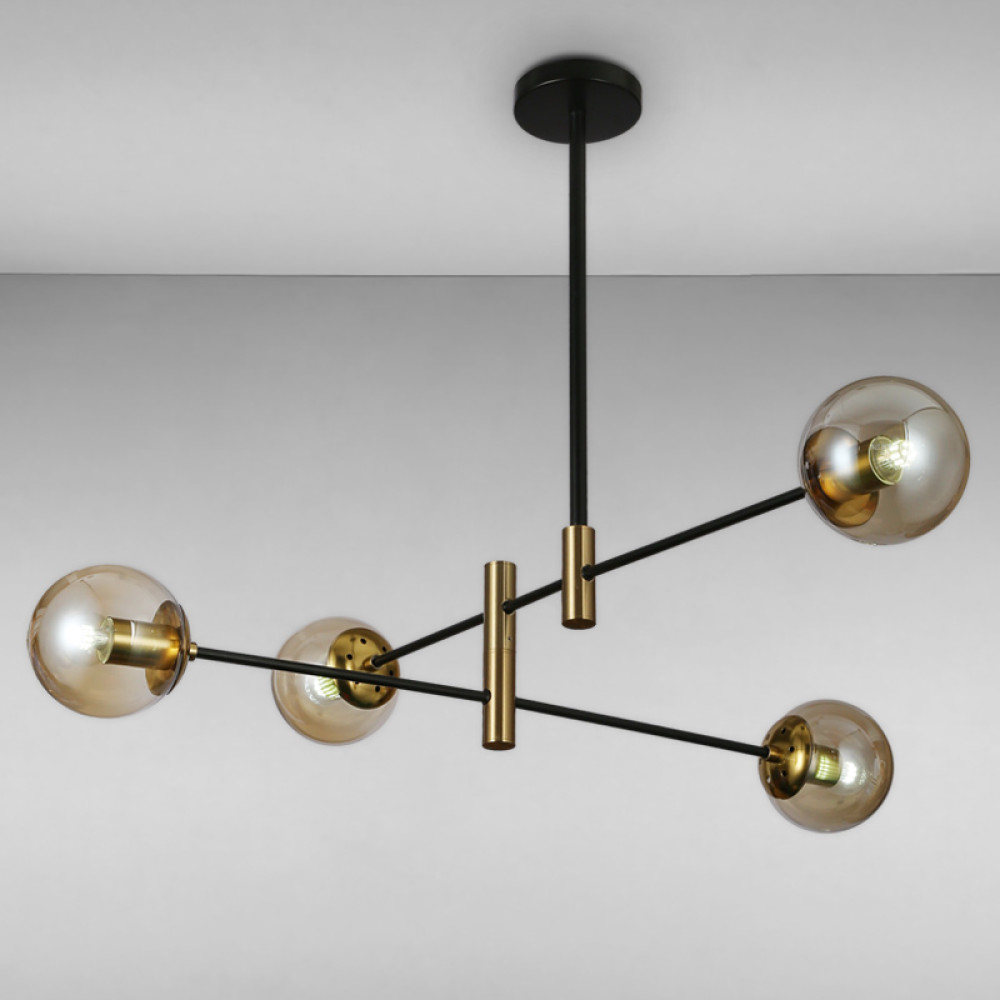 Люстра-молекула на жорсткому підвісі на чотири лампи з плафонами сферичної форми, у футуристичному стилі.