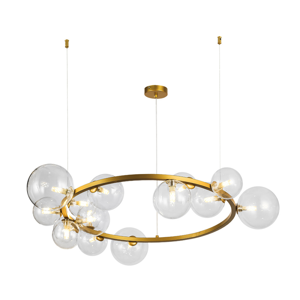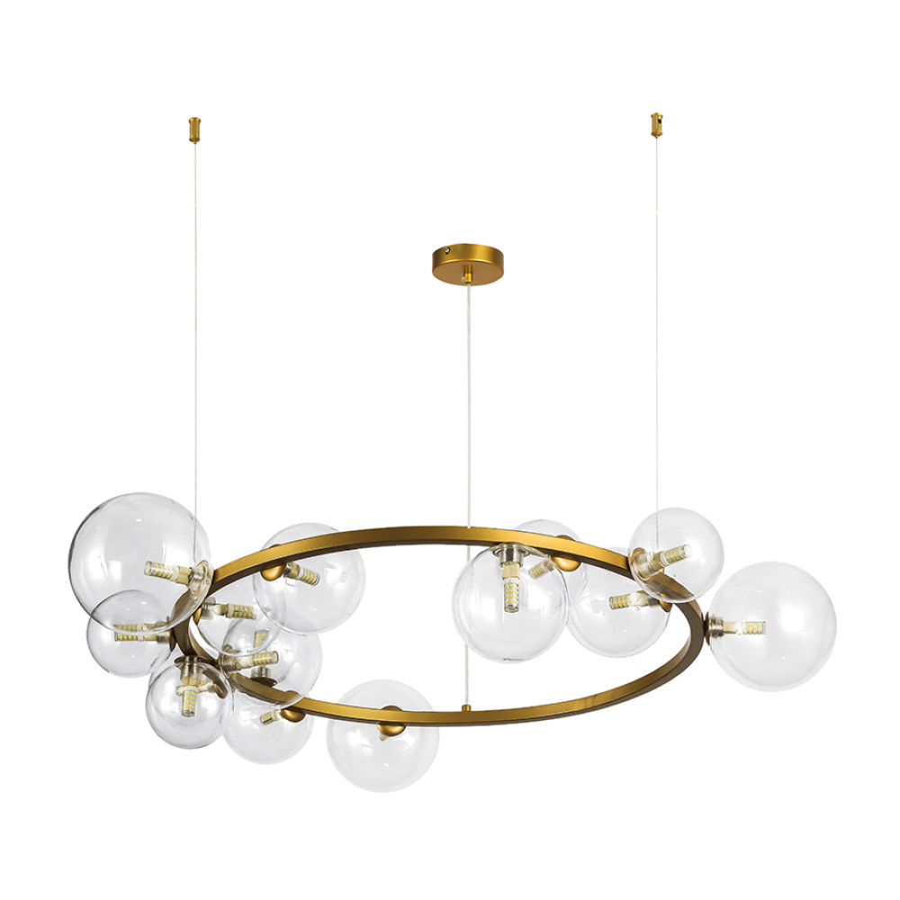 Сучасна стильна підвісна люстра-молекула з металевим корпусом форми кільця на якому розташовані п'ятнадцять ламп G9 зі скляними плафонами кулями діаметром 10 см, 12 см, 15 см.