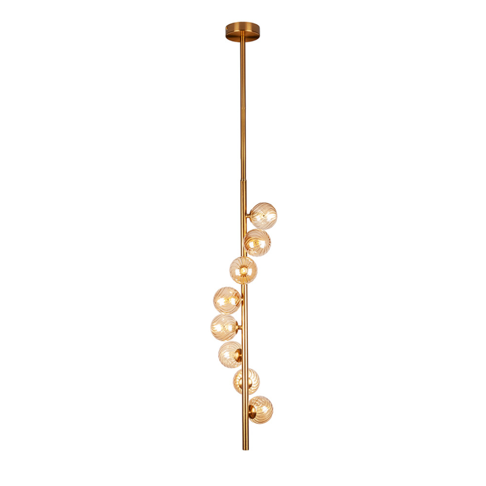Сучасна стельова люстра-молекула на вісім ламп зі скляними плафонами-кулями на довгому вертикальному металевому корпусі буде актуальна для високих стель.