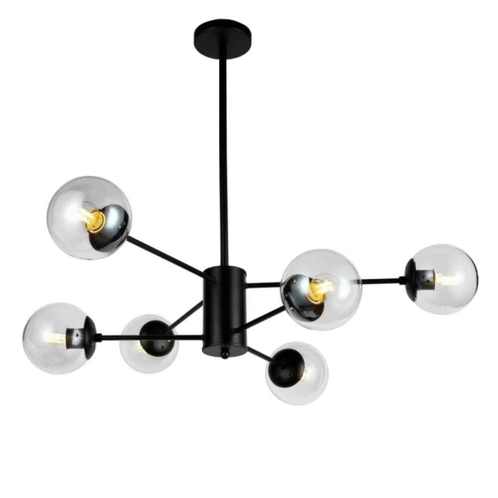 Стельова люстра-молекула на шість ламп у сучасному стилі з чорним металом та круглі скляні плафони прозорого кольору. Найкраще використовувати у приміщенні загальною площею 18 м. кв., при використанні ламп 6 Вт (LED) або 60 Вт (стандартна).
