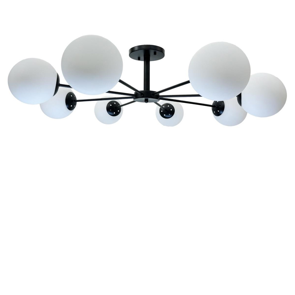 Каркас люстри виготовлений з металу у строгому чорному кольорі, що забезпечить сучасний та стильний вигляд. Вісім плафонів з матового скла додадуть вишуканості до дизайну. Люстра оснащена цоколем E27, що підходить для лампочок до 40 Ватів. Ви можете вибрати як енергозберігаючі, так і лампи розжарювання, залежно від вашої переваги та потреби у освітленні.