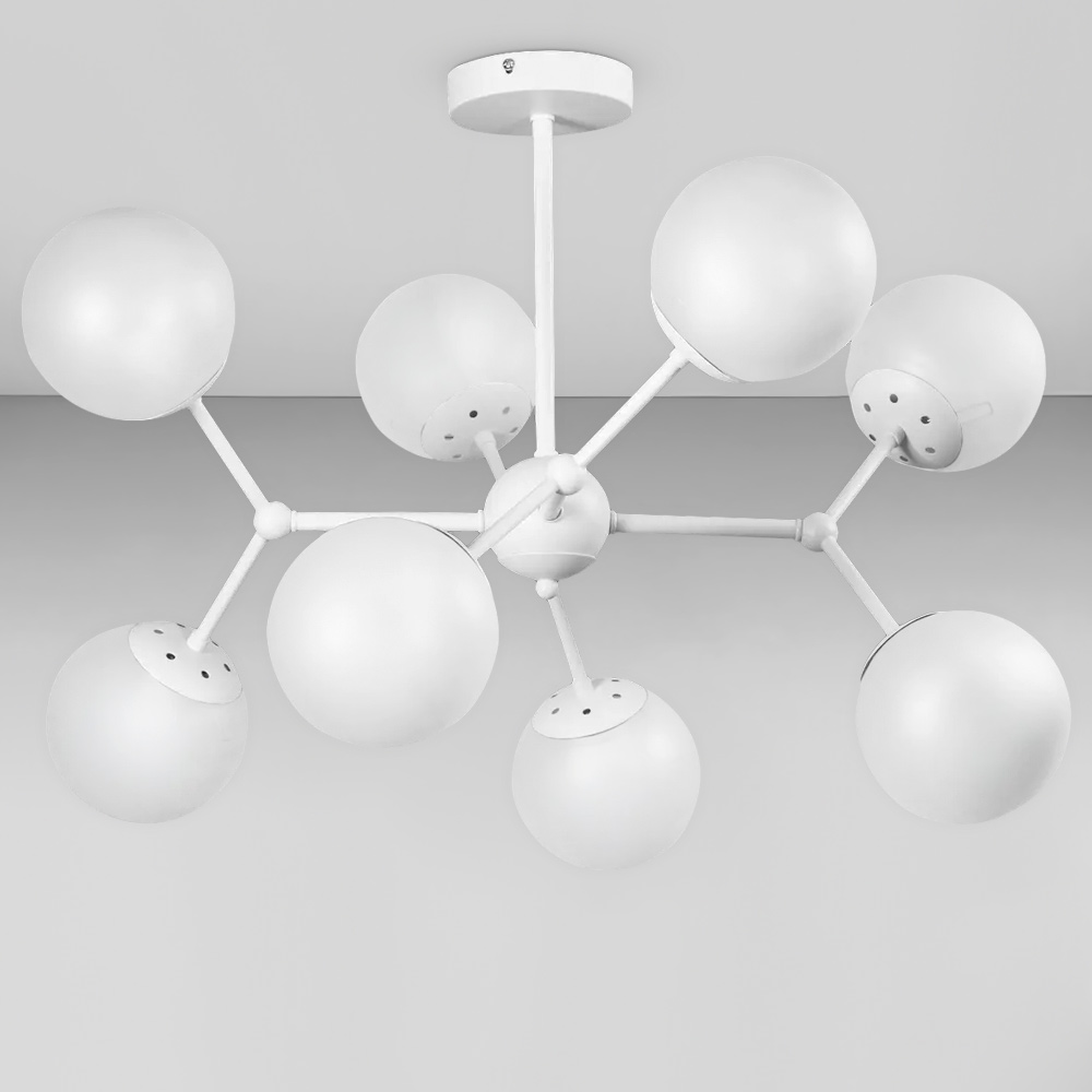 Стильна стельова люстра молекула на вісім ламп з круглими скляними плафонами-кулями.