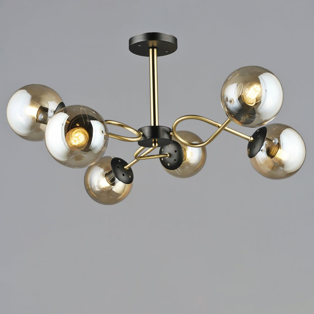 Сучасна стельова люстра-молекула на шість ламп з металевим корпусом у вигляді вигнутих трубок на кінцях яких розташовані скляні плафони-кулі бурштинового кольору. Найкраще ця люстра підійде для приміщень із загальною площею 18 м², при використанні ламп 6 Вт (LED) або 60 Вт (стандартна).