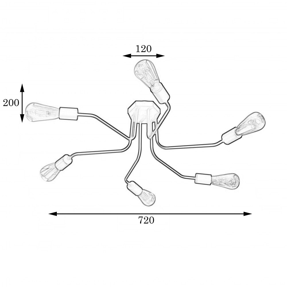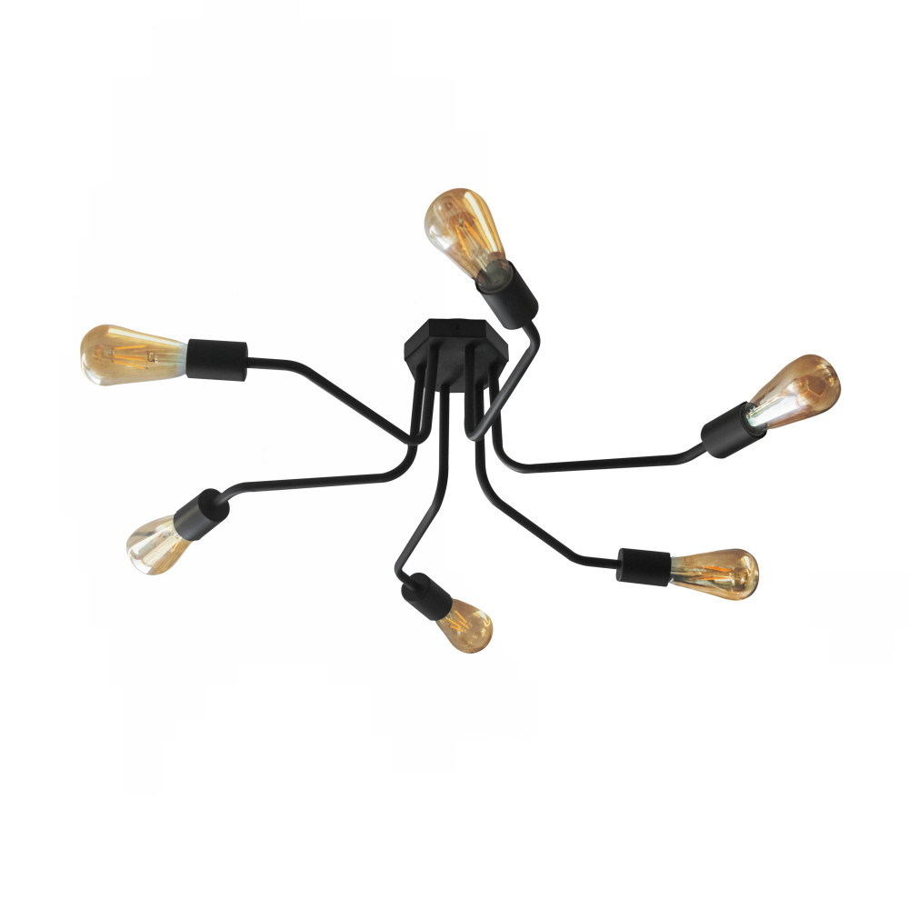 Стельова люстра-павук на шість ламп без плафонів.