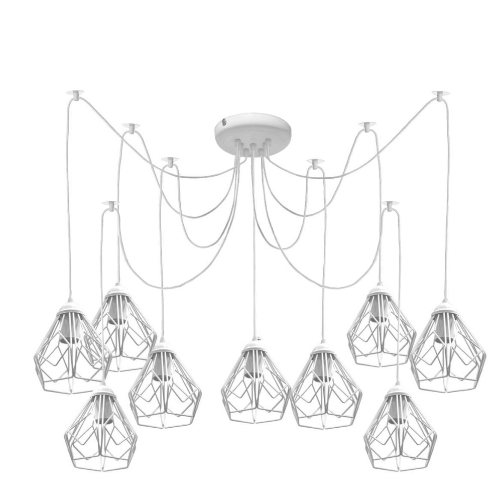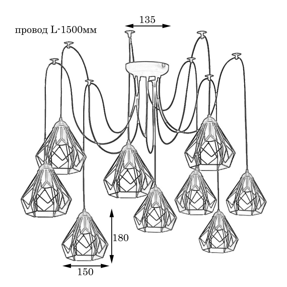 Підвісна люстра павук у стилі Лофт на дев'ять ламп з плафонами у вигляді металевої клітини конусної форми.Найкраще ця люстра підійде для приміщень із загальною площею до 27 м², при використанні лампочок 6 Вт (LED) або 60 Вт (стандартна).