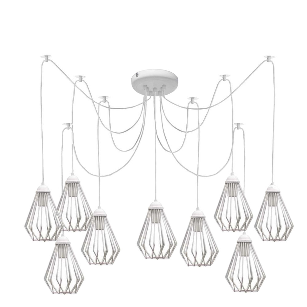 Підвісна люстра павук у стилі лофт на дев'ять ламп з плафоном у вигляді металевого каркаса конусної форми.