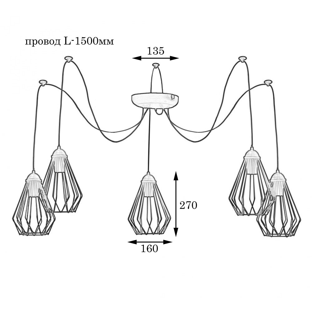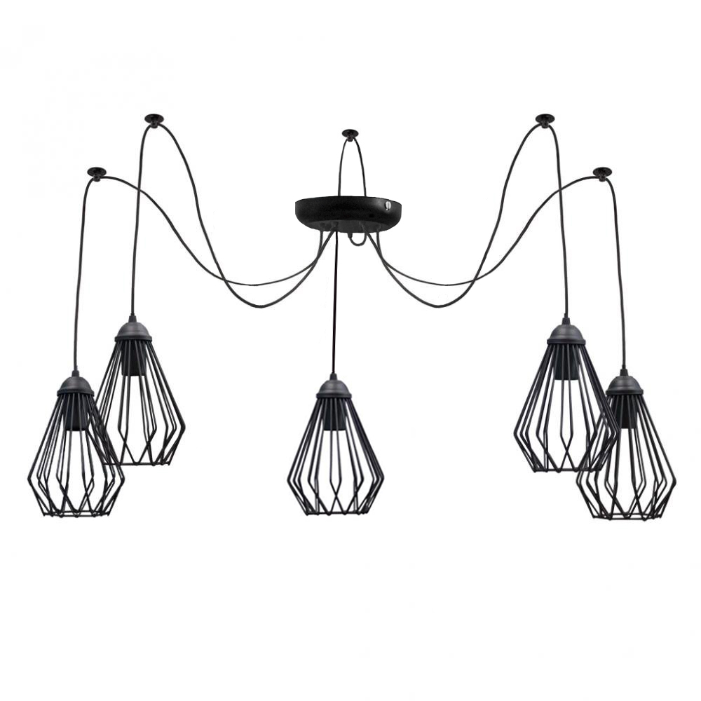Підвісна люстра павук у стилі лофт на п'ять ламп з плафоном у вигляді металевого каркаса конусної форми.