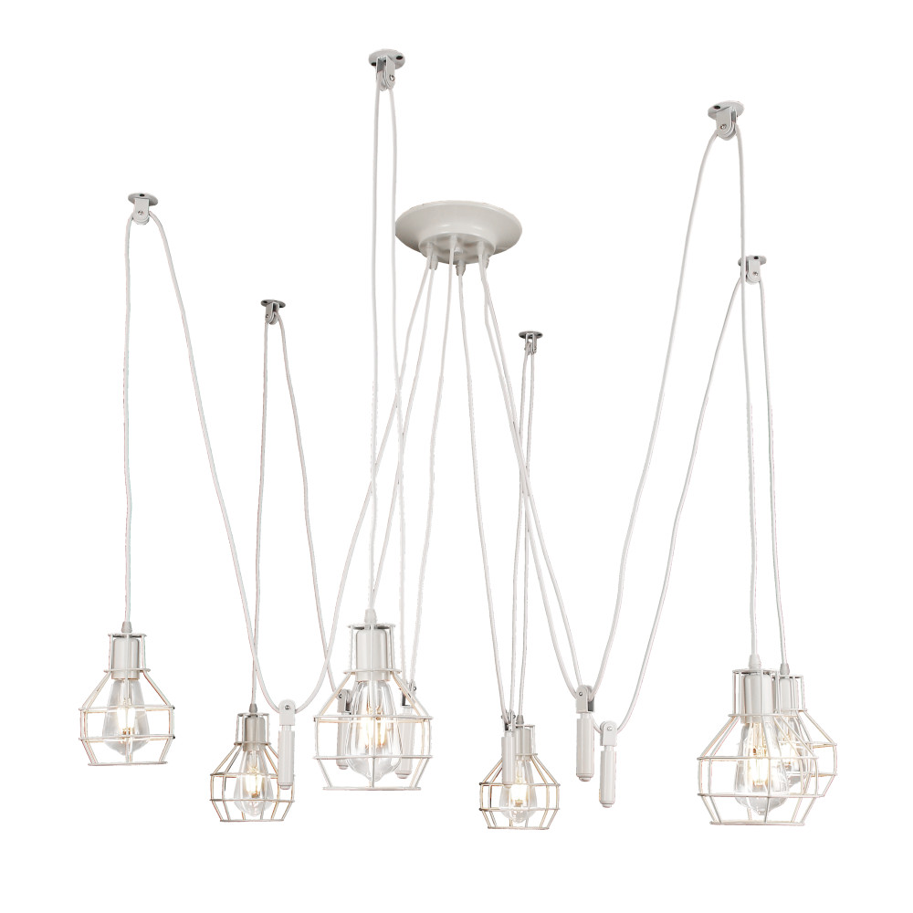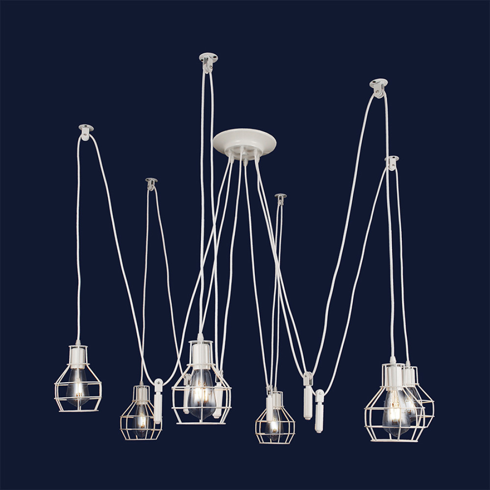 Підвісна люстра павук у стилі лофт на шість ламп з плафонами у вигляді металевого каркасу. Ви можете самостійно виставити потрібну довжину дроту на кожен плафон.