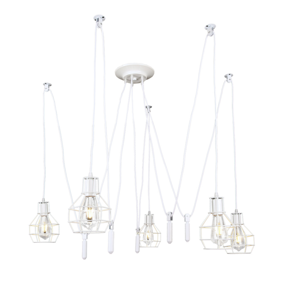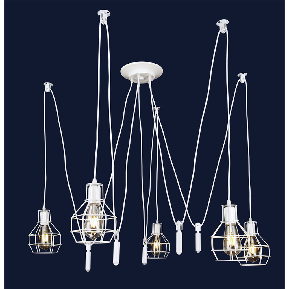 Підвісна люстра павук у стилі лофт на п'ять ламп з плафонами у вигляді металевого каркаса. Ви можете самостійно виставити потрібну довжину дроту на кожен плафон.