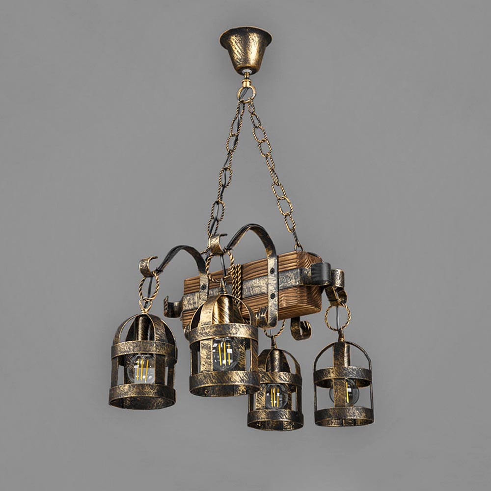 Декоративна підвісна люстра на чотири лампи з металевими плафонами на дерев'яному корпусі.