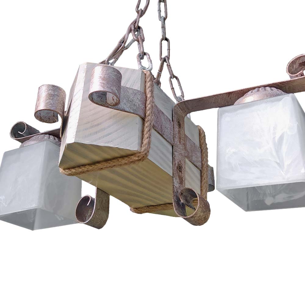 Декоративна підвісна люстра (підвісний світильник) у скандинавському стилі, на дві лампи зі скляними квадратними плафонами та дерев'яним корпусом.