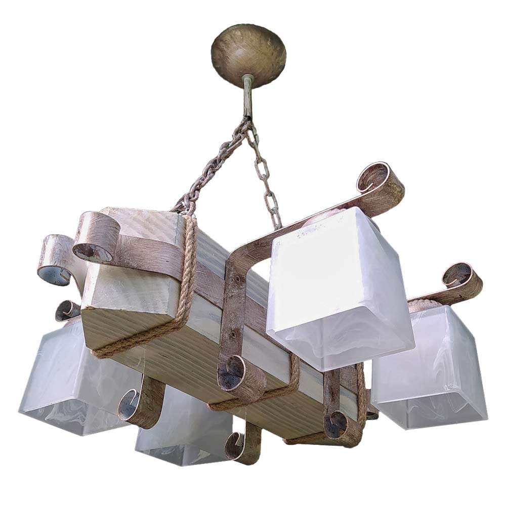Декоративна підвісна люстра (підвісний світильник) у скандинавському стилі, на чотири лампи зі скляними квадратними плафонами та дерев'яним корпусом.