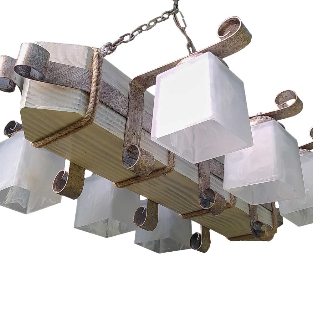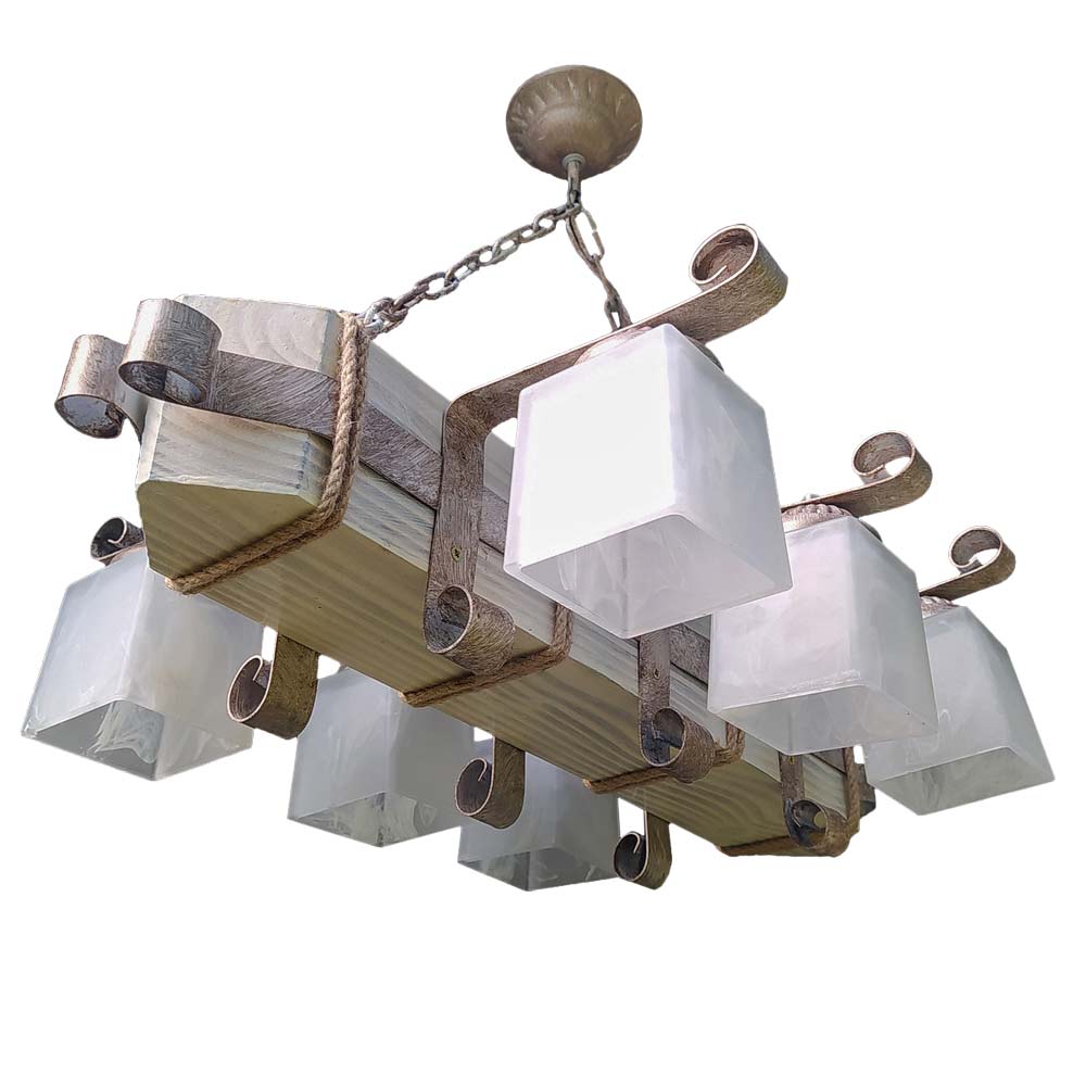 Декоративна підвісна люстра (підвісний світильник) у скандинавському стилі, на шість ламп зі скляними квадратними плафонами та дерев'яним корпусом.