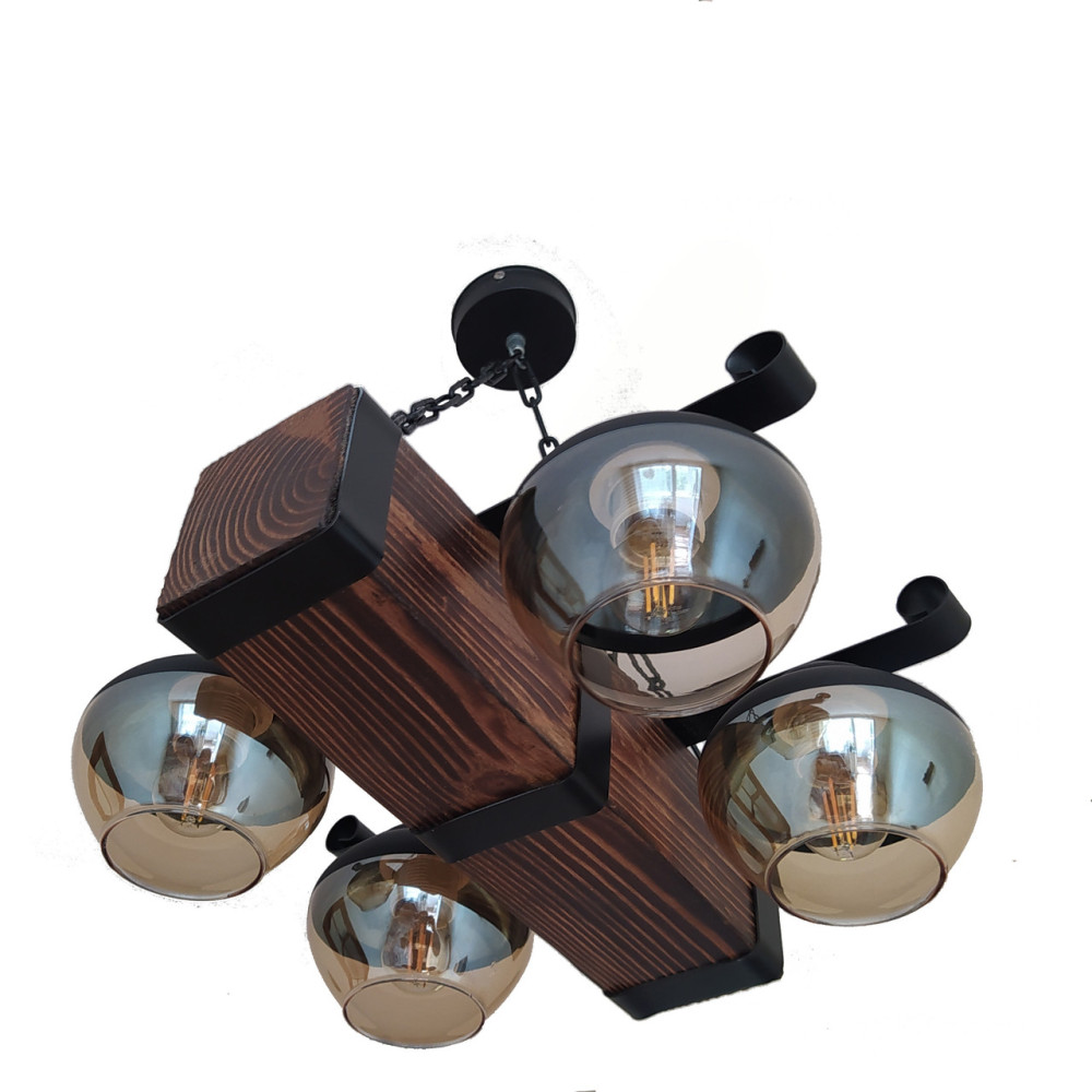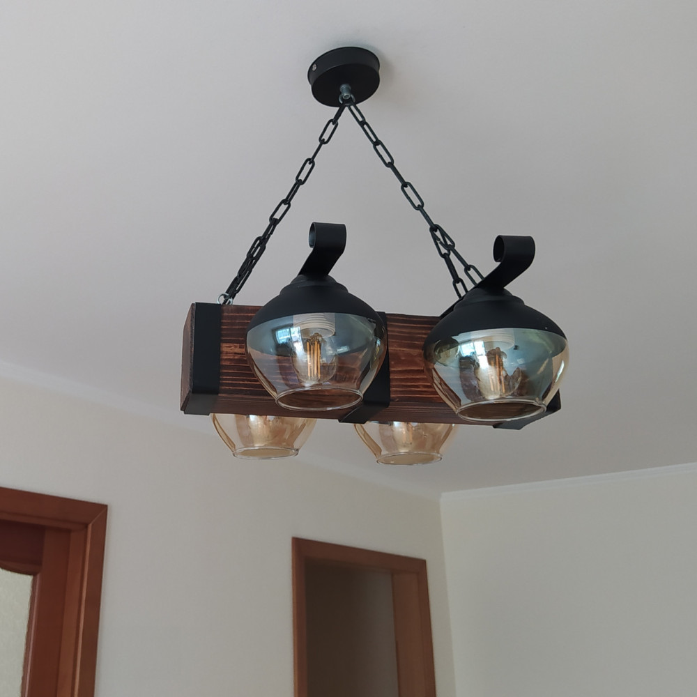 Декоративна підвісна люстра в стилі Кантрі на чотири лампи з дерев'яним корпусом у вигляді балки зі скляними плафонами з боків. Найкраще використовувати у приміщенні загальною площею 12 м2, при використанні ламп 6 Вт (LED) або 60 Вт стандартна.