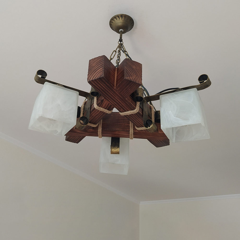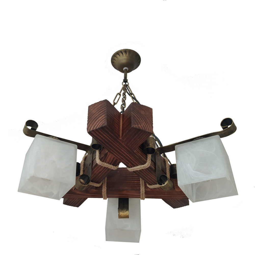 Декоративна підвісна люстра у стилі Кантрі, на три лампи зі скляними квадратними плафонами та дерев'яним корпусом.