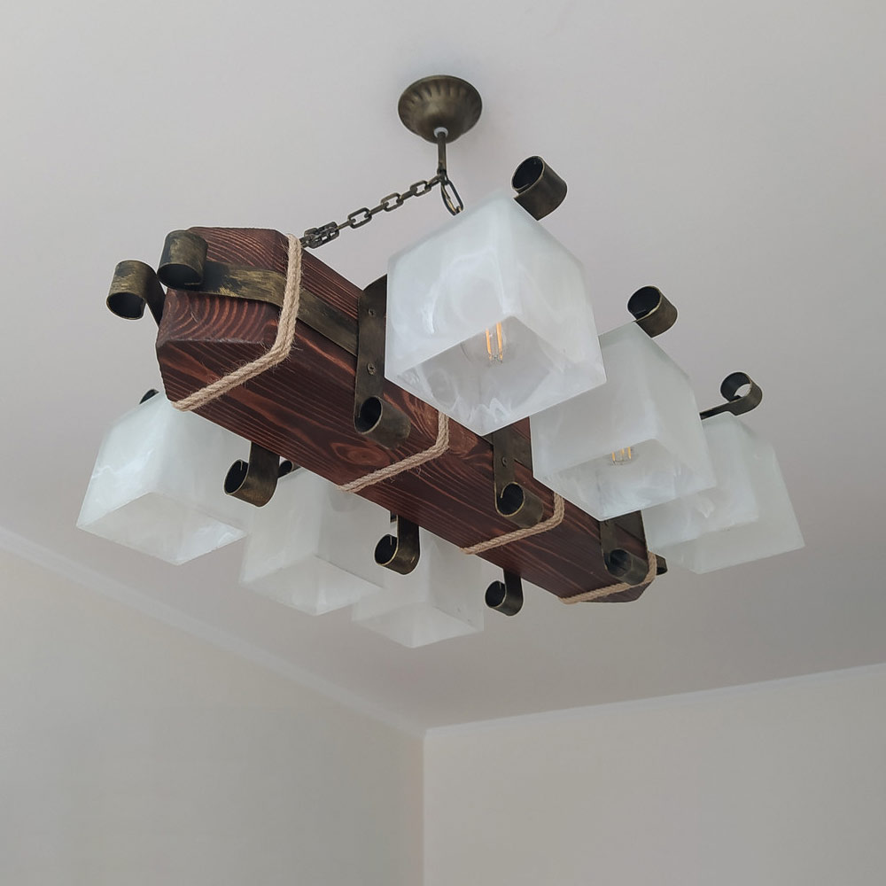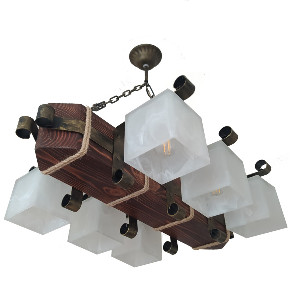 Декоративна люстра в стилі Кантрі на шість ламп з дерев'яним корпусом у вигляді балки зі скляними квадратними плафонами з боків.