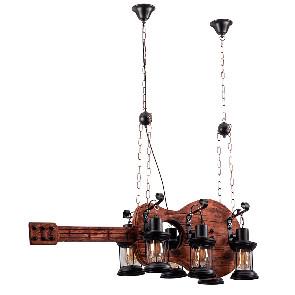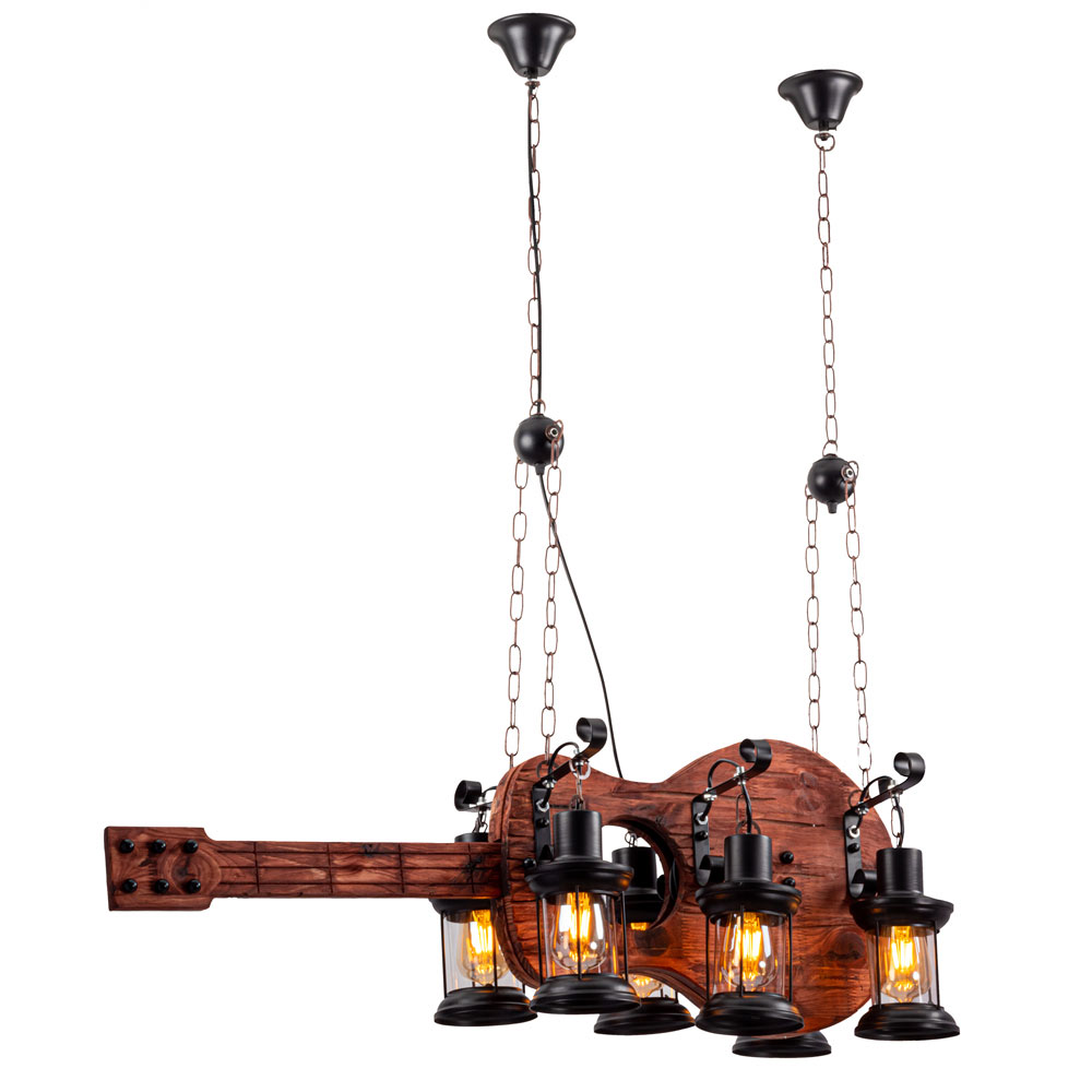 Декоративна підвісна люстра з дерева на шість ламп з корпусом у вигляді гітари.