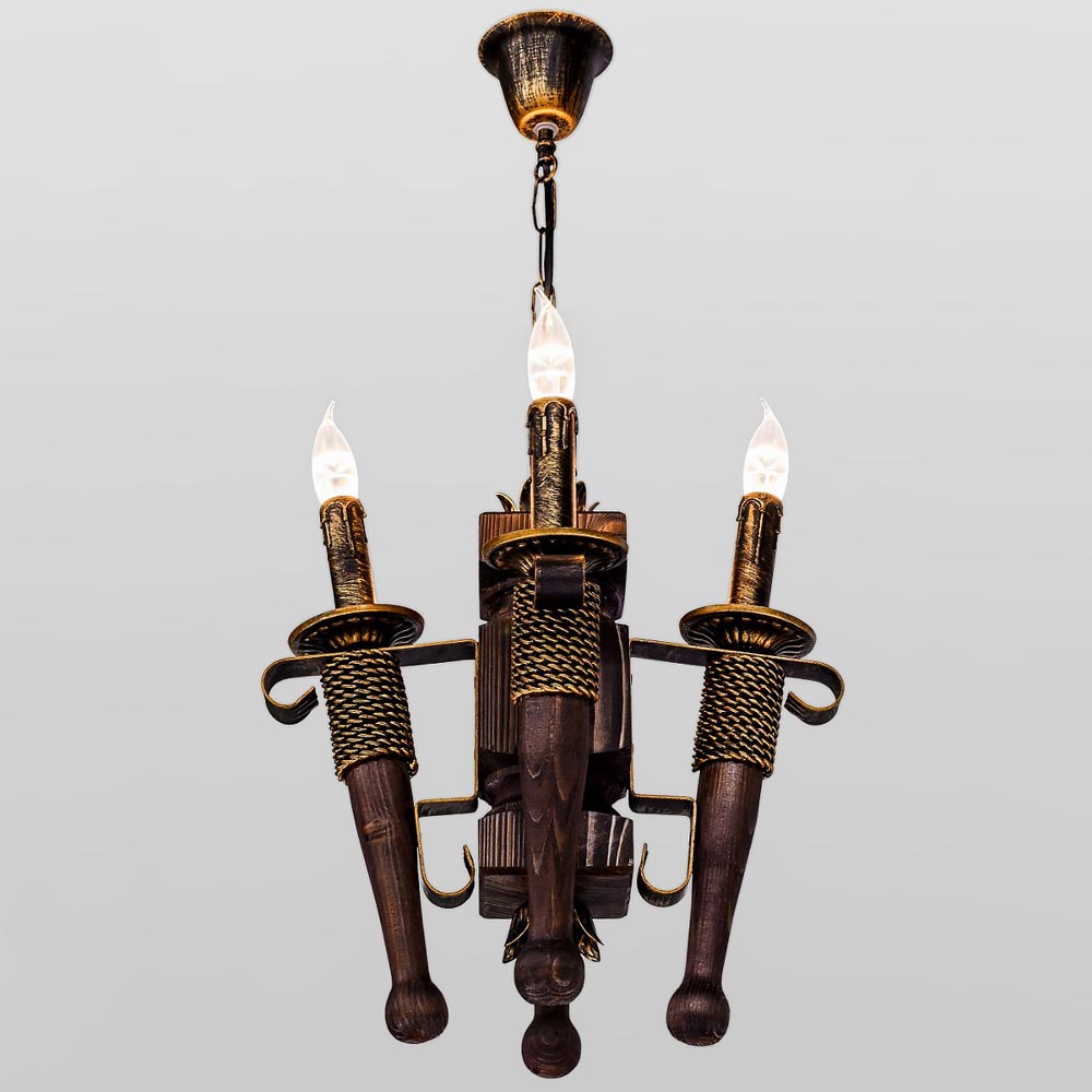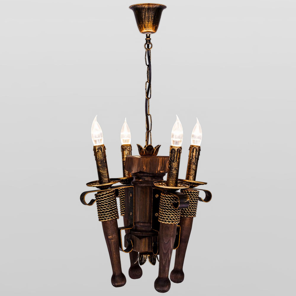 Декоративна підвісна люстра в стилі Кантрі, на чотири лампи свічки без плафонів з дерев'яним корпусом.