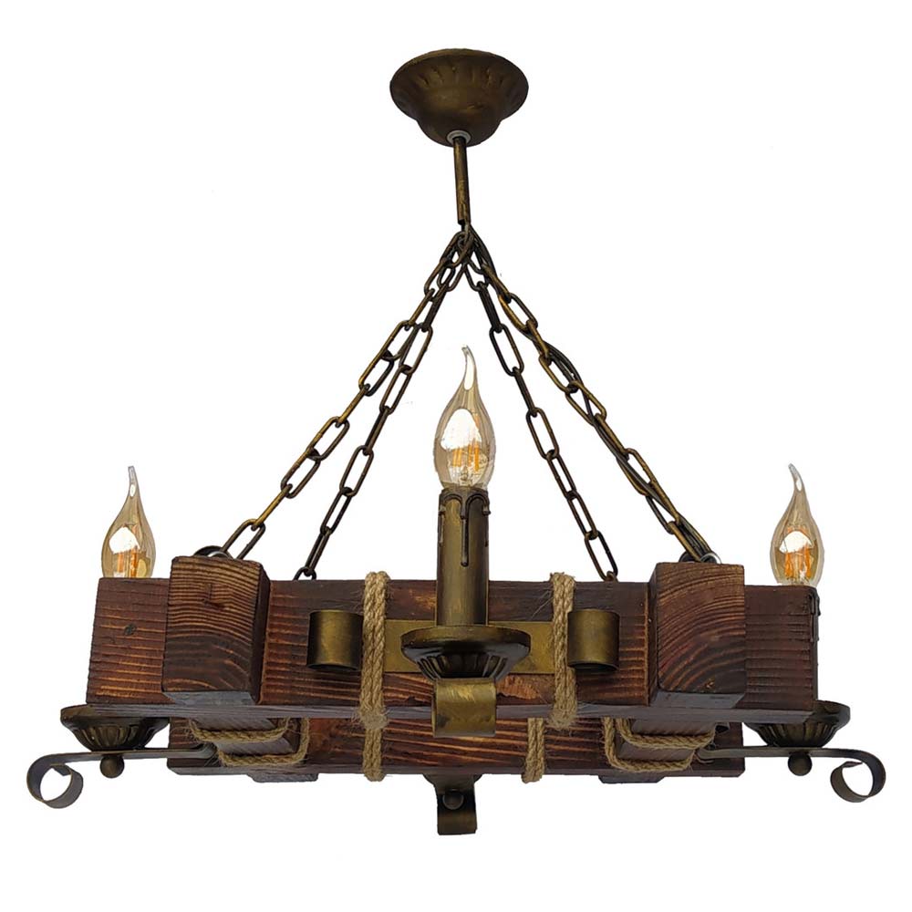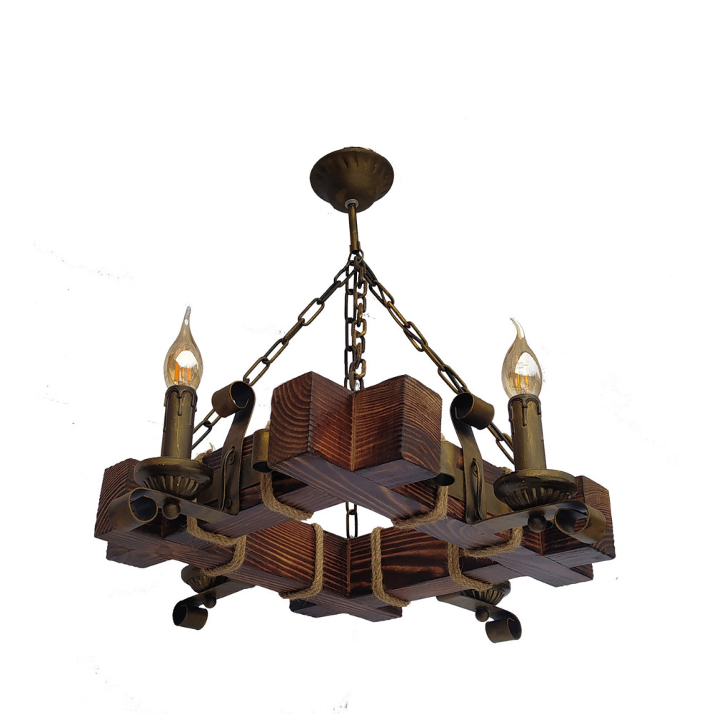 Декоративна підвісна люстра в стилі Кантрі, на чотири лампи свічки без плафонів з дерев'яним корпусом.