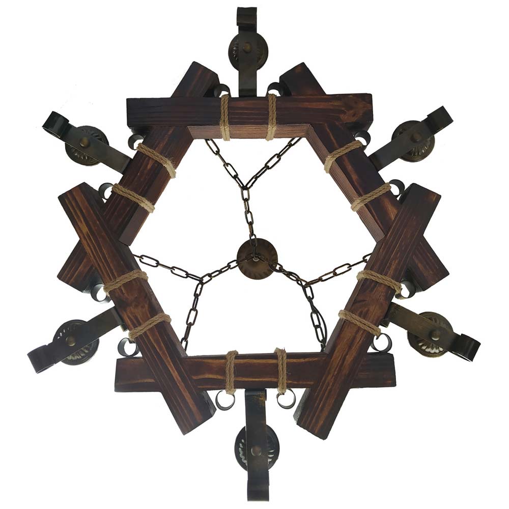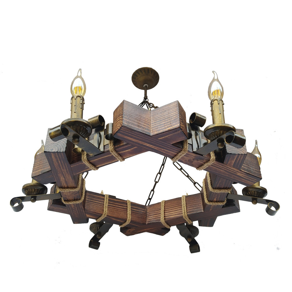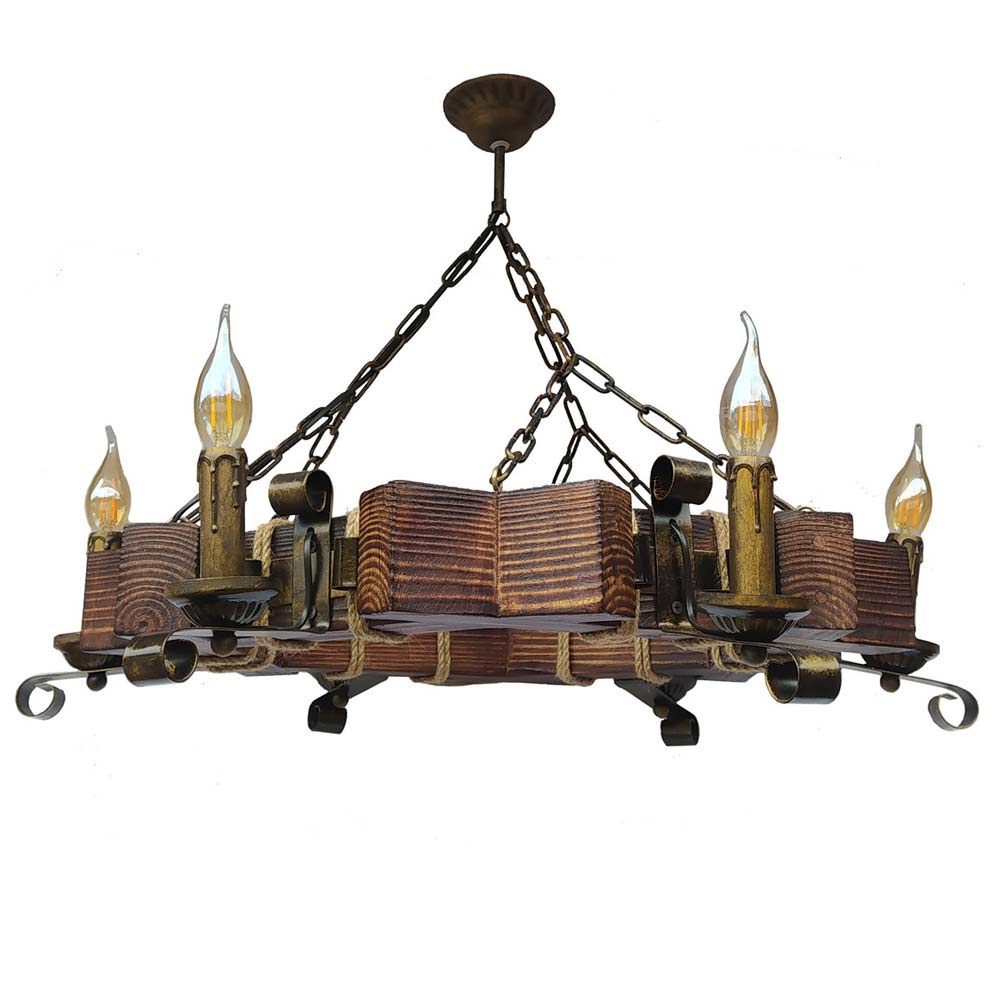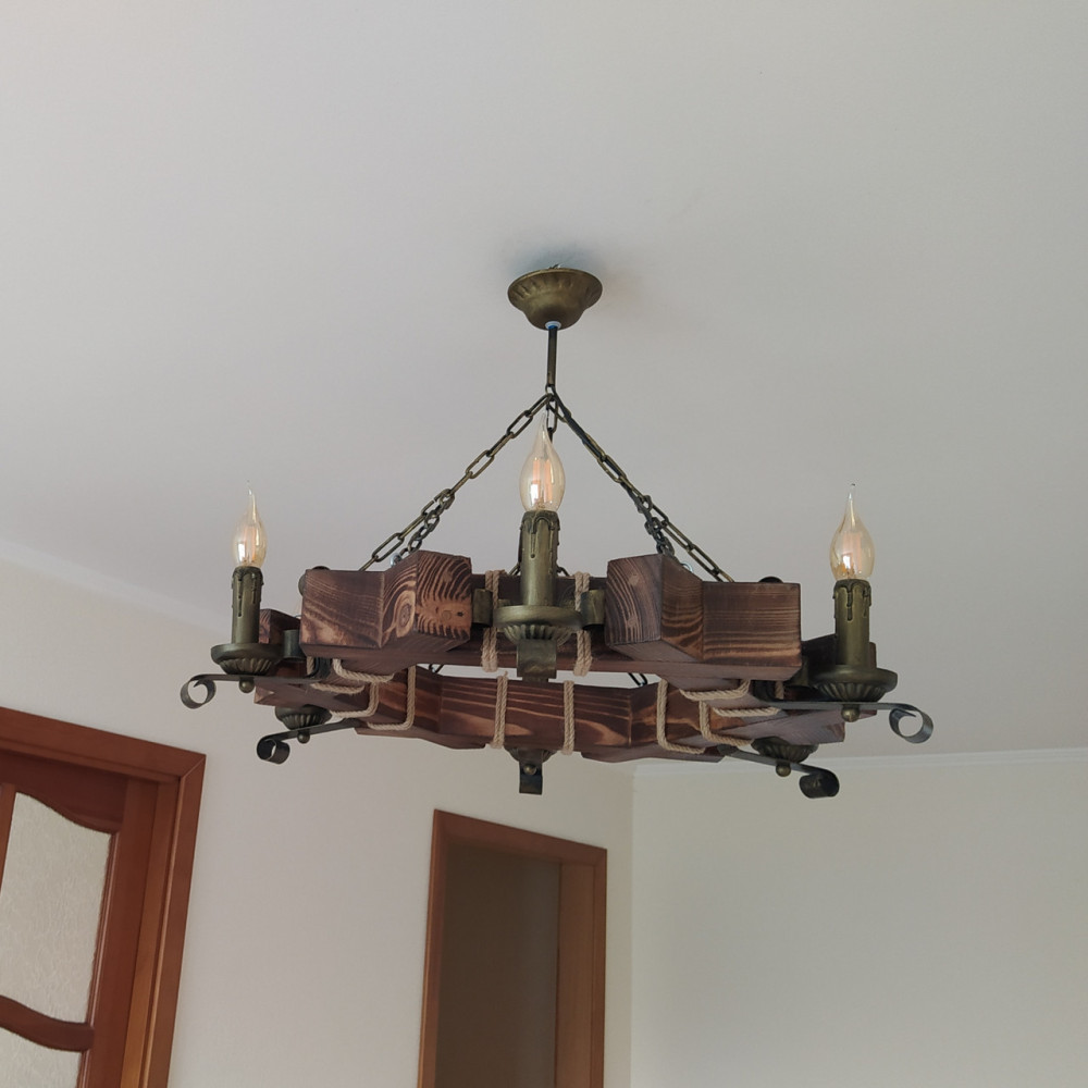 Декоративна підвісна люстра в стилі Кантрі, на шість ламп свічки без плафонів з дерев'яним корпусом.