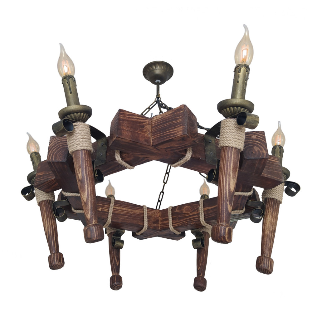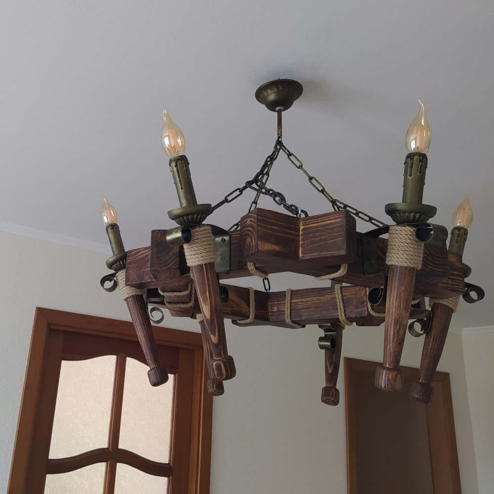 Декоративна люстра в стилі Кантрі, на шість ламп свічок без плафонів з дерев'яним корпусом у вигляді смолоскипів.