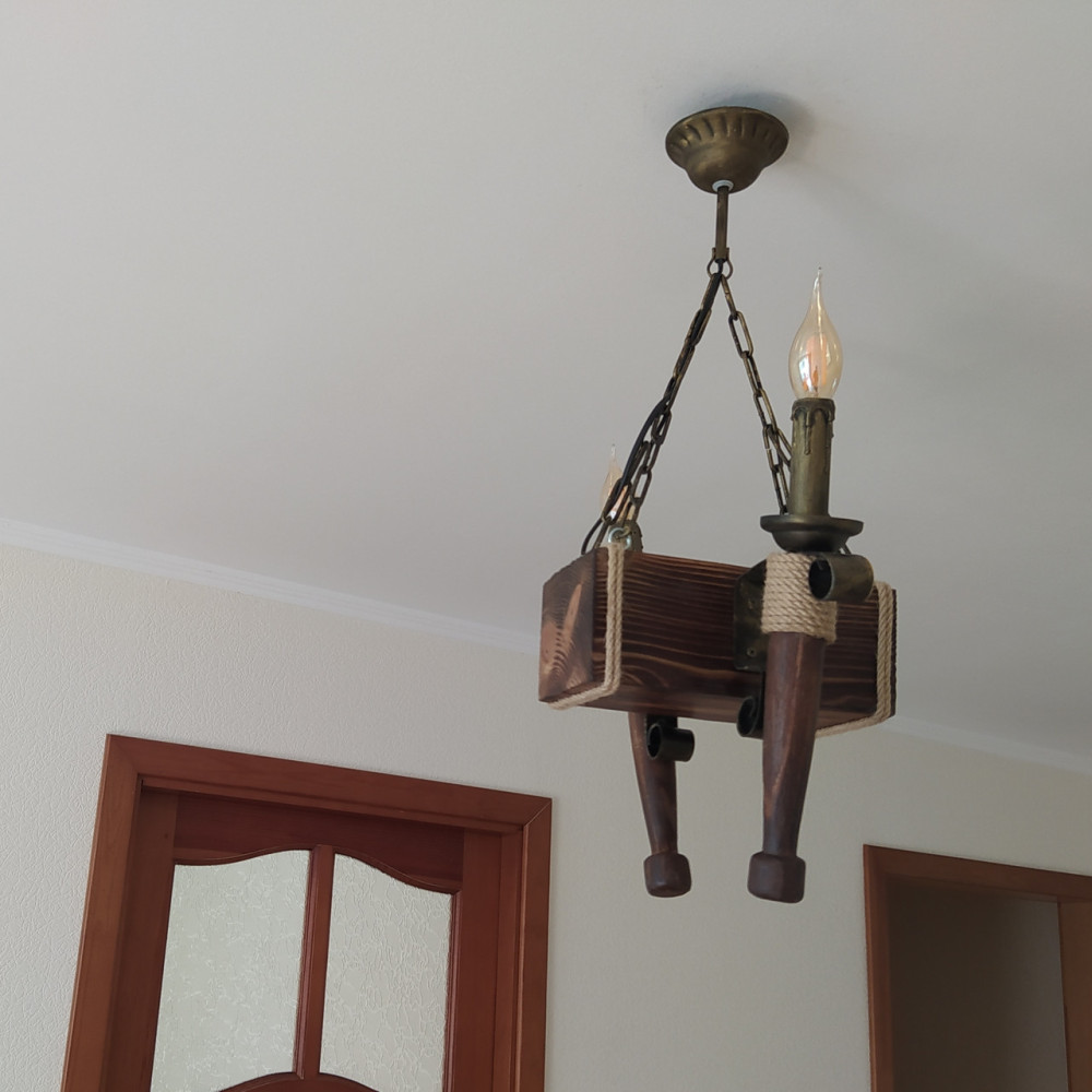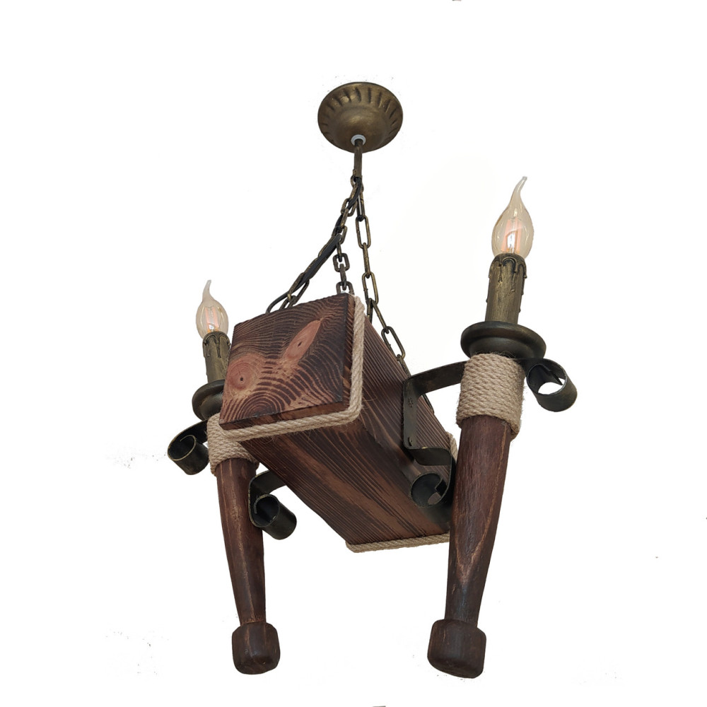 Декоративна люстра в стилі Кантрі, на дві лампи свічки без плафонів з дерев'яним корпусом у вигляді смолоскипів.