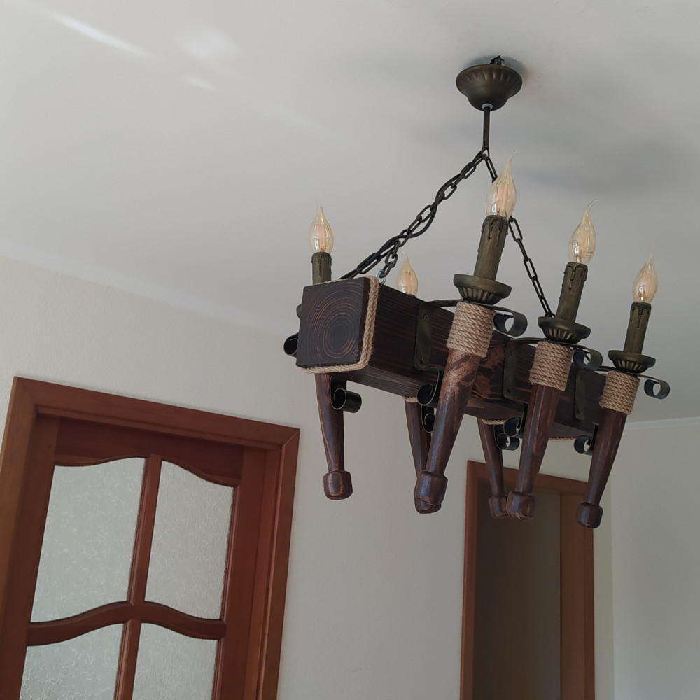 Декоративна підвісна люстра в стилі Кантрі, на шість ламп свічок без плафонів з дерев'яним корпусом у вигляді балки зі смолоскипами з боків.