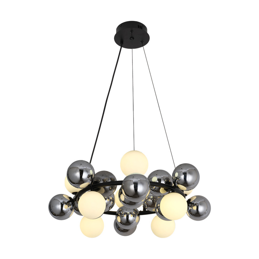 Підвісна декоративна люстра молекула на вісім ламп G9 зі скляними плафонами-кульками білого та дзеркально-хромового кольору на корпусі у вигляді кільця. Найкраще ця люстра підійде для освітлення 24 м² приміщення при використанні лампочок 6 Вт (LED), буде актуальна для приміщень з високими стелями.Висота підвісу регулюється, що дозволяє адаптувати підвіс під різні простори і потреби.