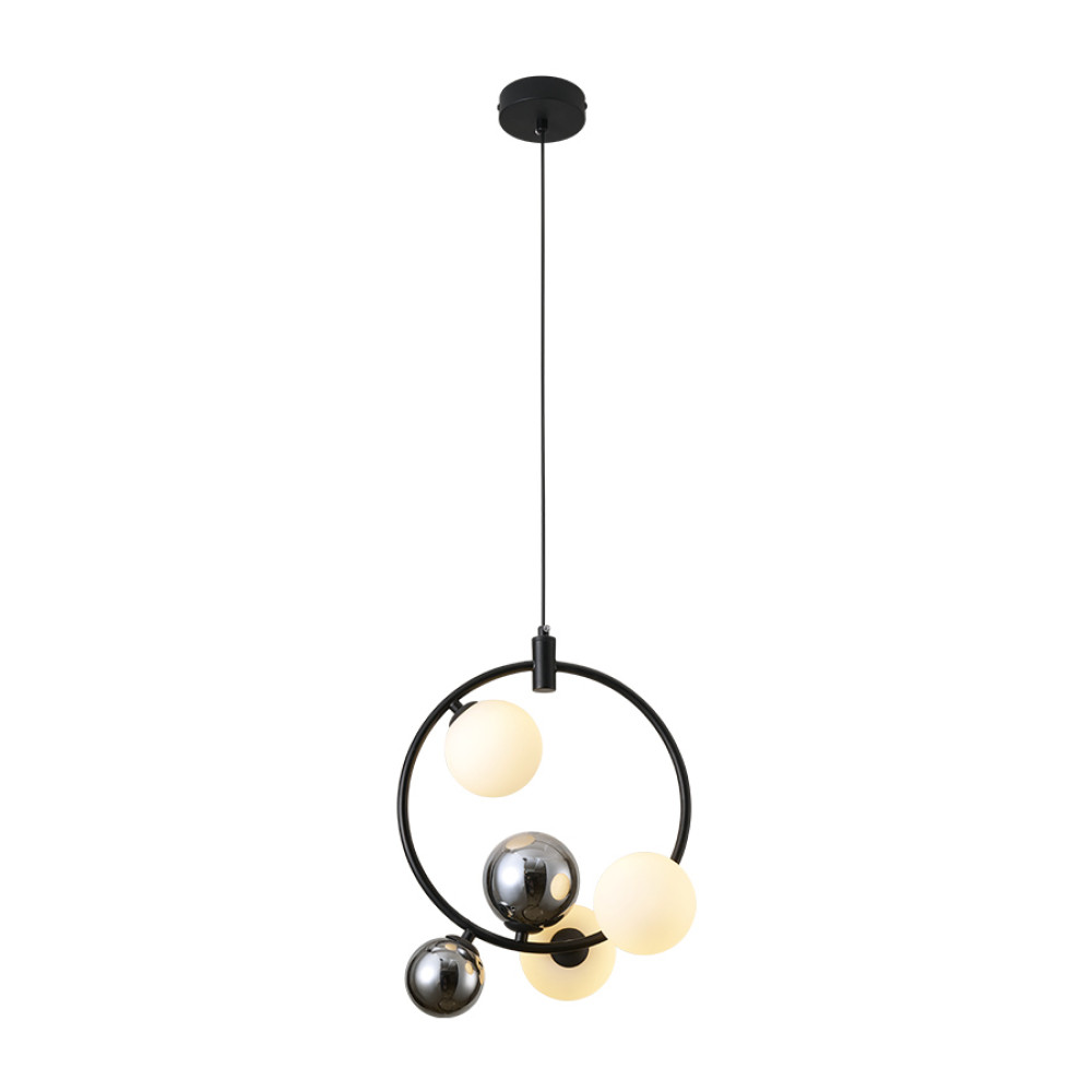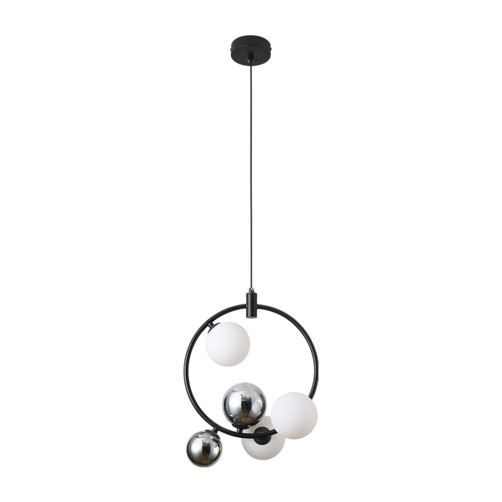 Підвісна декоративна люстра молекула на три лампи G9 зі скляними плафонами-кулями білого та дзеркально-хромового кольору на корпусі у вигляді вертикального кільця. Найкраще ця люстра підійде для освітлення 9 м² приміщення при використанні лампочок 6 Вт (LED), буде актуальна для приміщень з високими стелями.Висота підвісу регулюється, що дозволяє адаптувати підвіс під різні простори і потреби.
