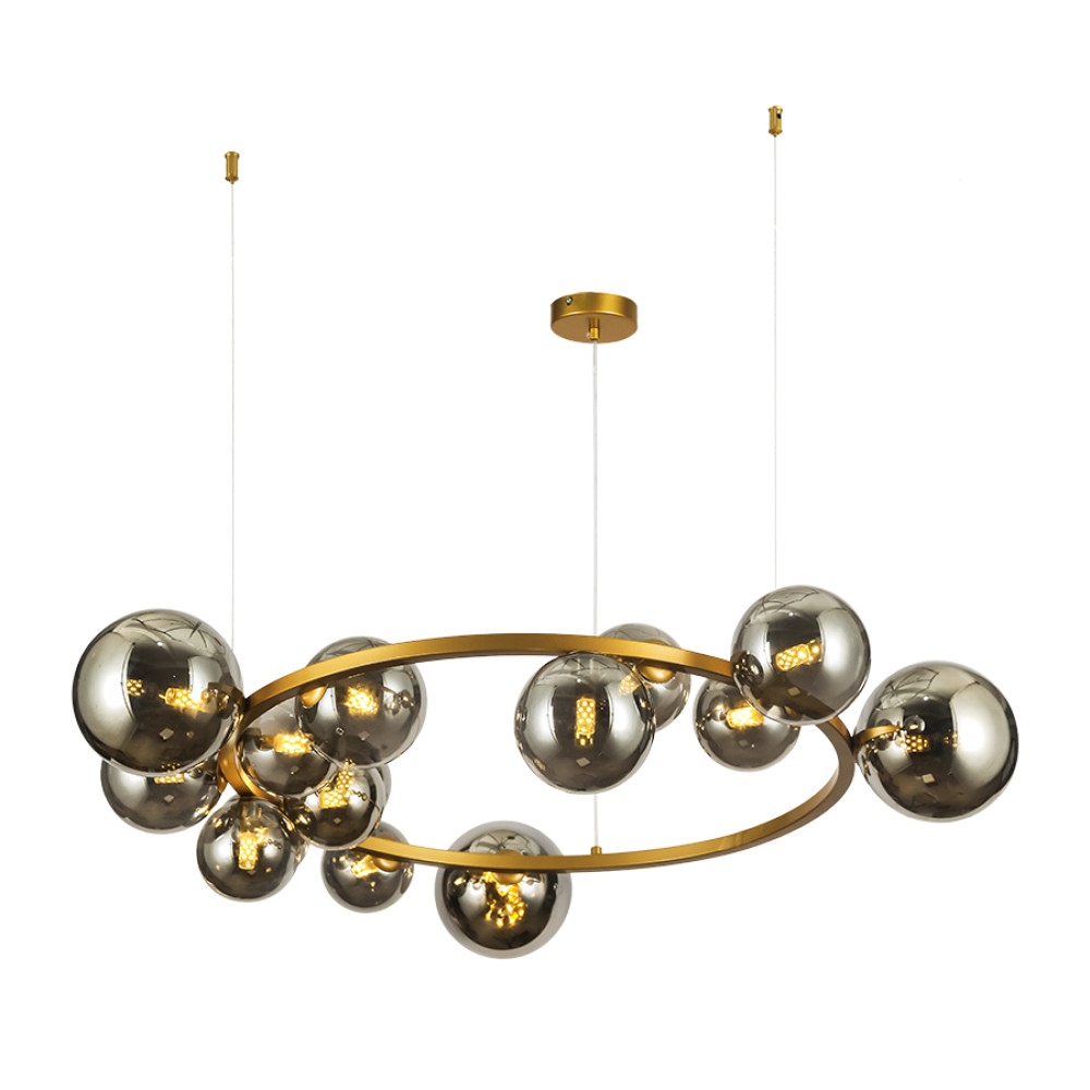 Підвісна декоративна люстра-молекула на 15 ламп G9 з корпусом у вигляді кільця, на якому розташовані скляні плафони-кулі діаметром 100мм, 120мм, 150мм.