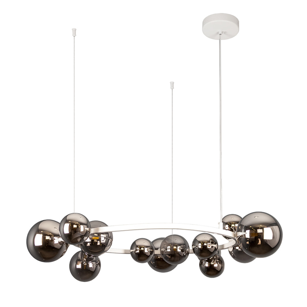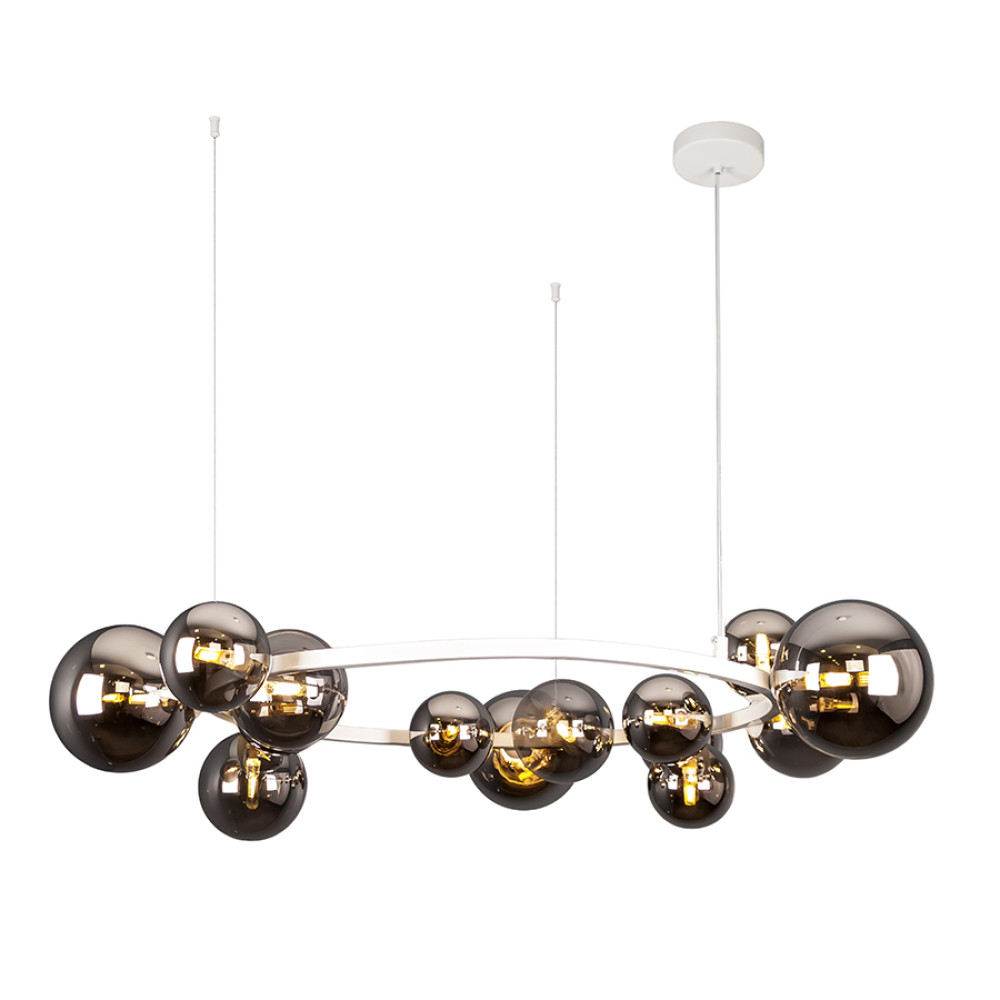Підвісна декоративна люстра-молекула на 15 ламп G9 з корпусом у вигляді кільця, на якому розташовані скляні плафони-кулі діаметром 100мм, 120мм, 150мм.