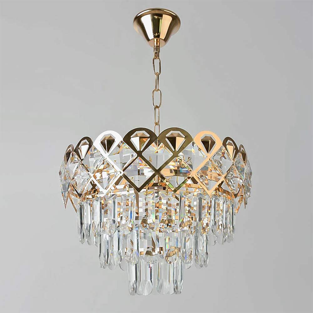 - Металевий каркас у золотистому кольорі та кришталеві підвіски створюють ефектний блиск, який підкреслить статус вашого будинку.