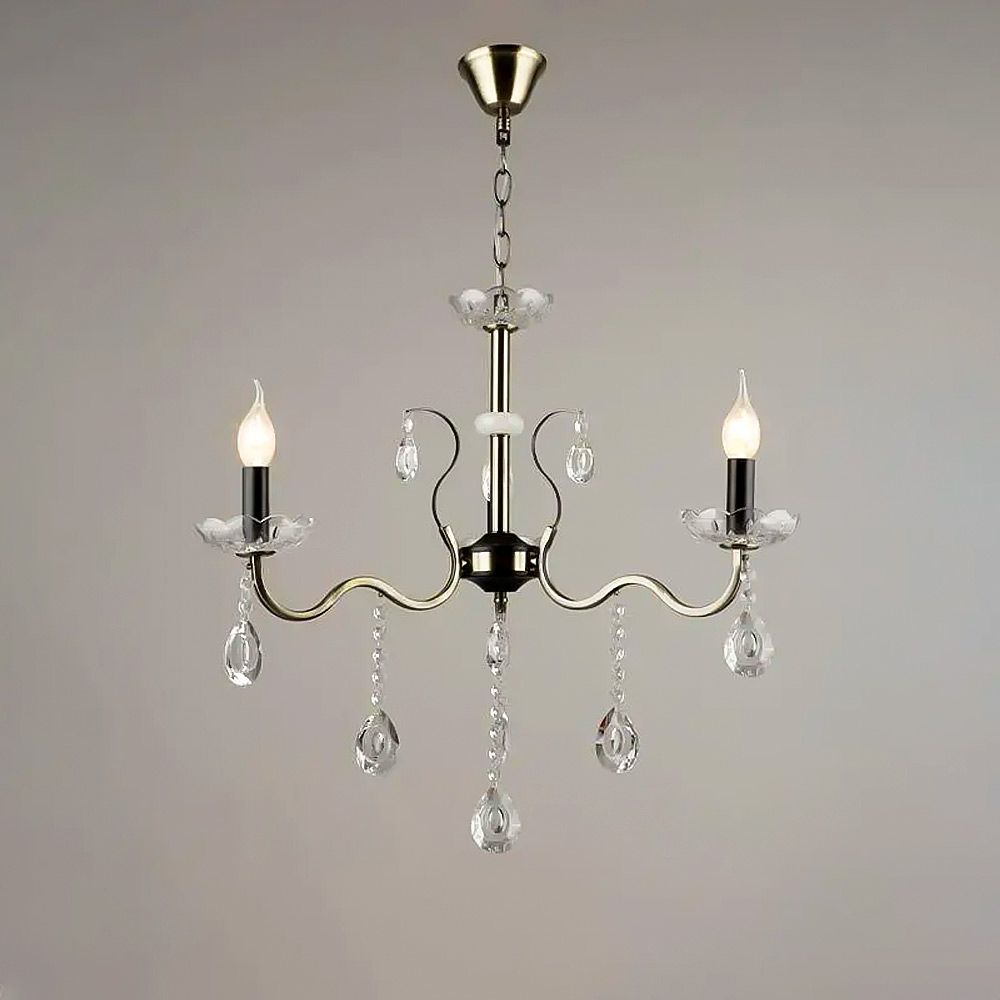 Класична підвісна люстра на три лампи у вигляді свічника з кришталевими підвісками.