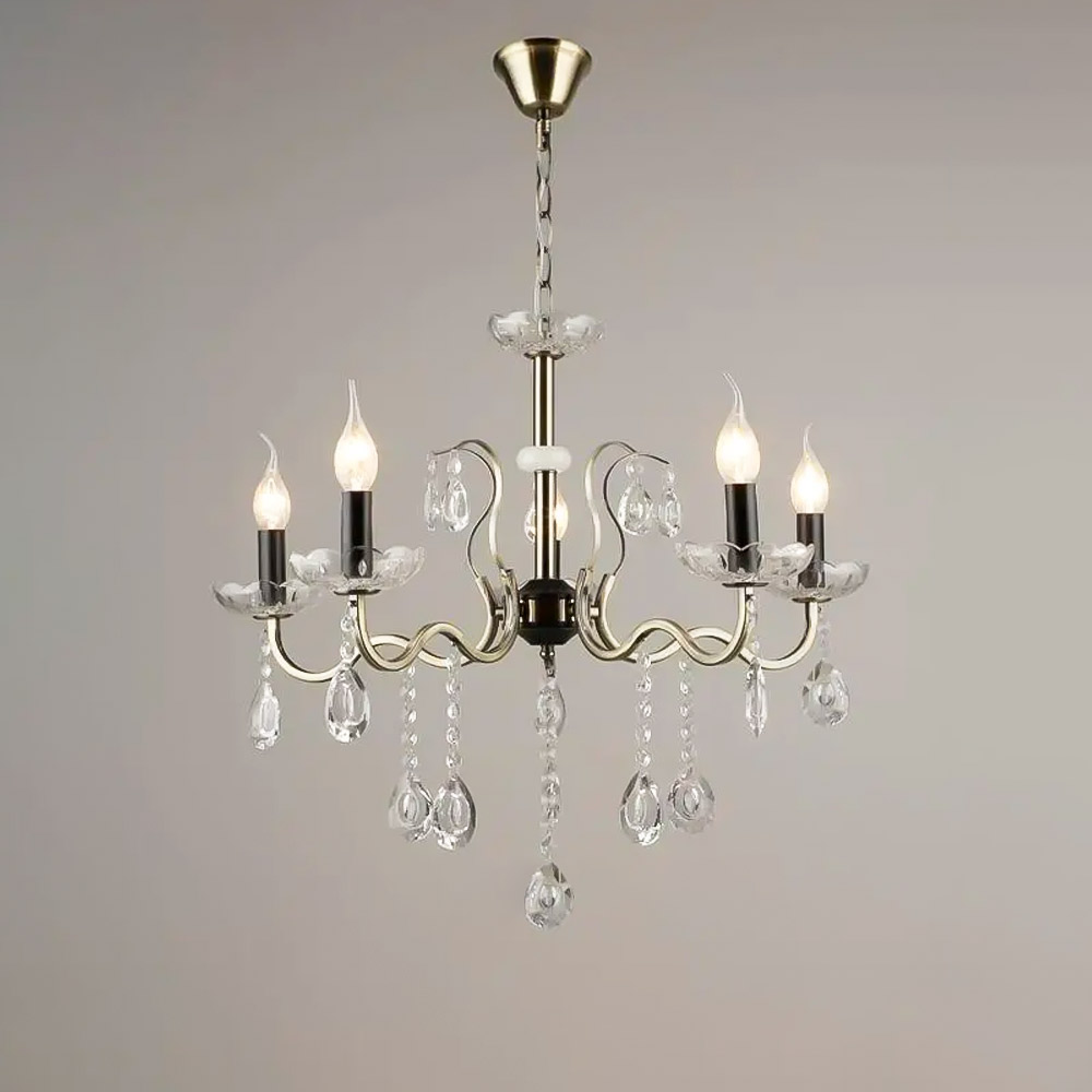 Класична підвісна люстра на п'ять ламп у вигляді свічника з кришталевими підвісками.