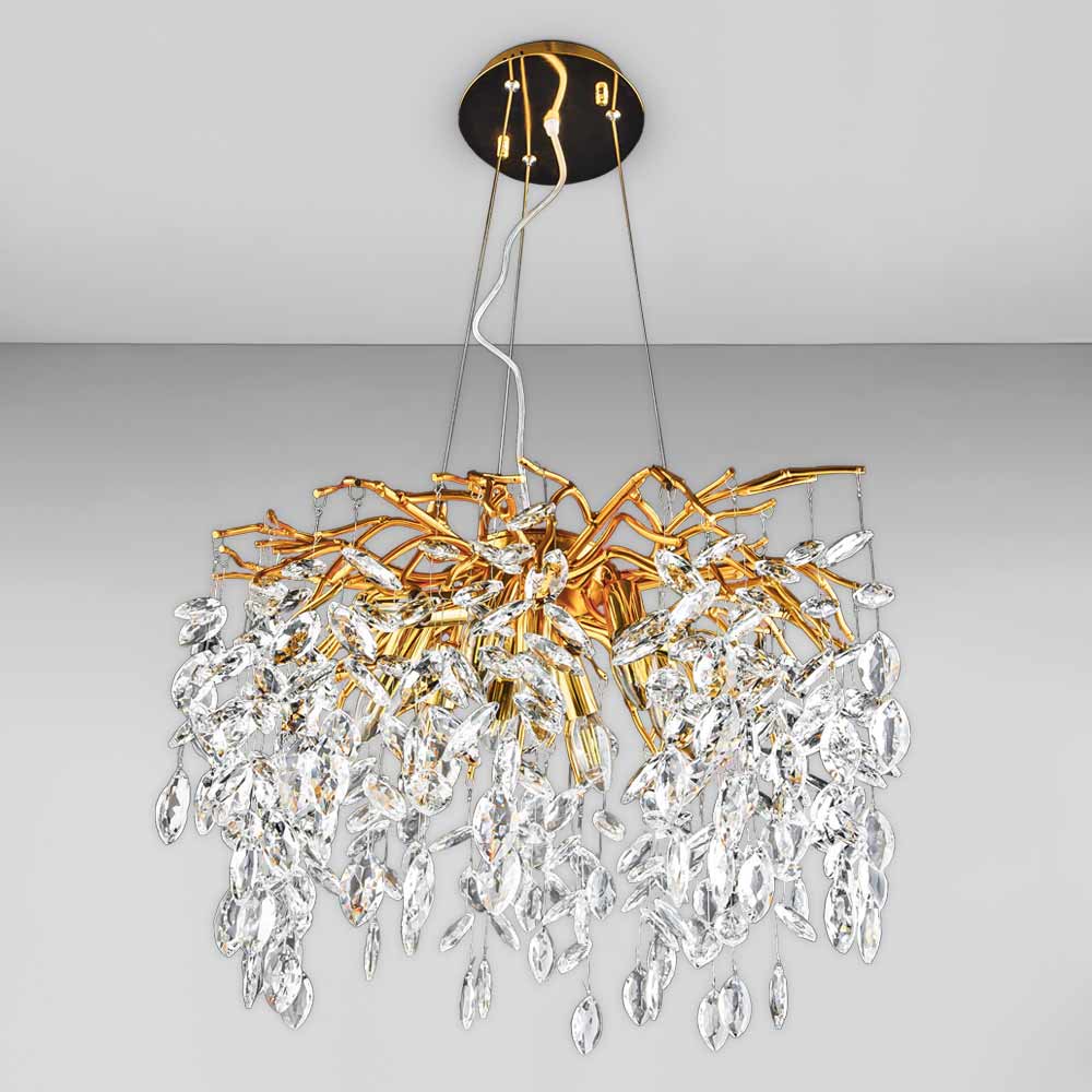 Стильна підвісна кришталева люстра на десять ламп. Люстра виконана у вигляді декоративної гілки з кришталевим листям.