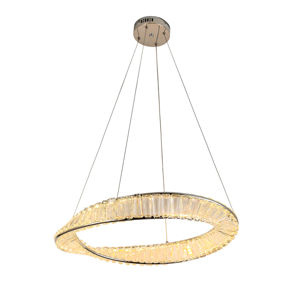 Сучасна декоративна підвісна LED люстра на одне джерело світла з регулюванням колірної температури та пультом управління. Незвичайний дизайн люстри представлений у вигляді світлодіодного кільця з металевою основою на яку кріпляться декоративні прямокутні скляні камінці, що м'яко розсіюють світло і створюють розкішний блискучий ефект.