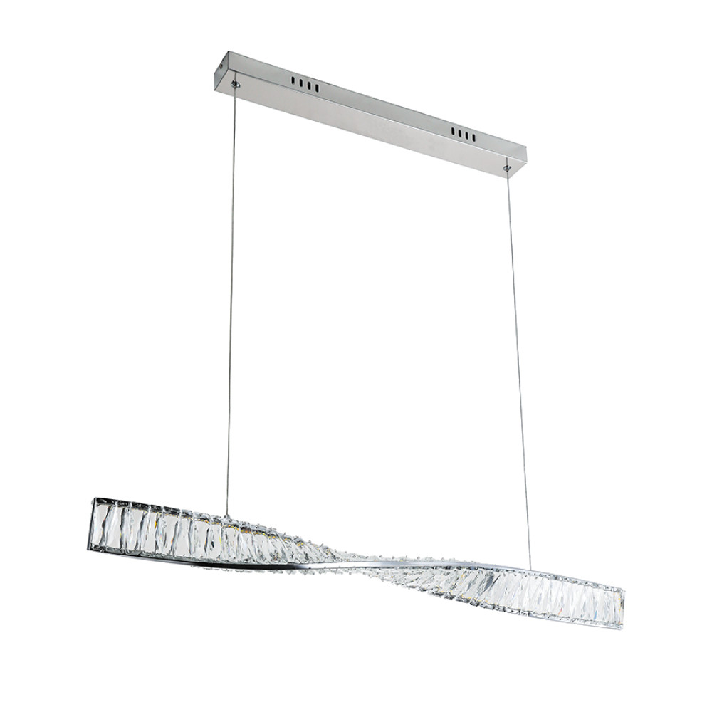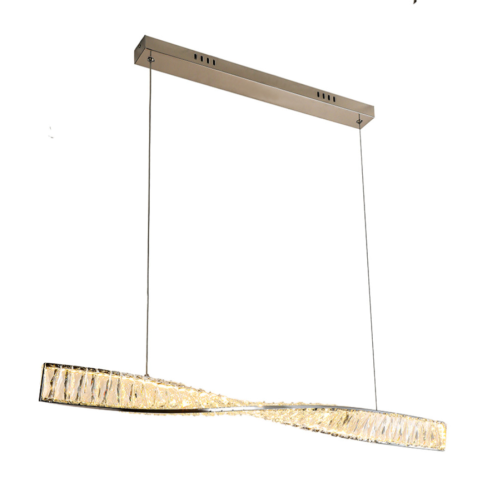 Сучасна декоративна підвісна LED люстра на одне джерело світла з регулюванням колірної температури та пультом управління. Незвичайний дизайн люстри представлений у вигляді світлодіодної планки з металевою основою скрученої форми на яку кріпляться декоративні прямокутні скляні камінці, що м'яко розсіюють світло і створюють розкішний блискучий ефект.