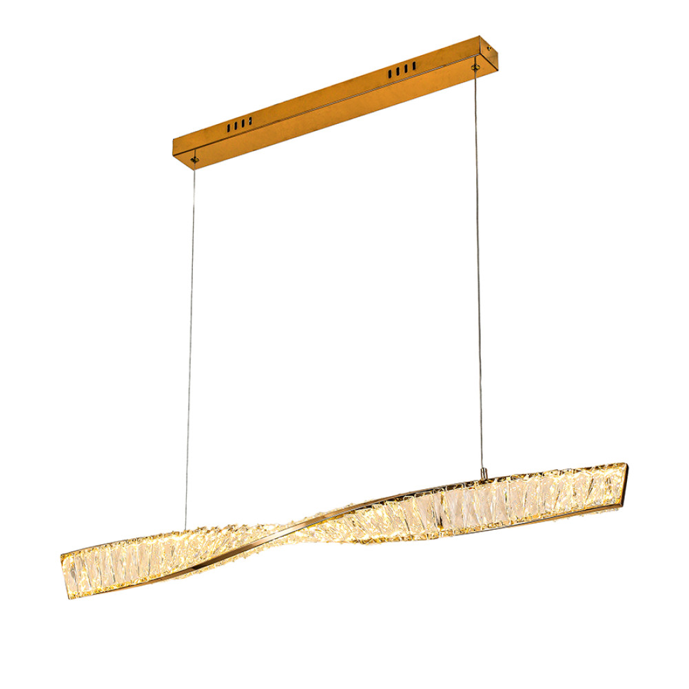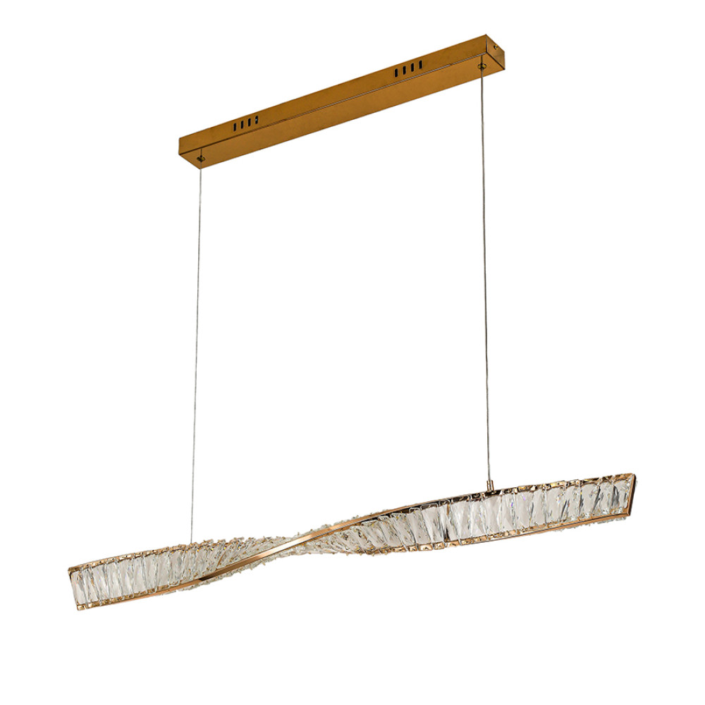 Сучасна декоративна підвісна LED люстра на одне джерело світла з регулюванням колірної температури та пультом управління. Незвичайний дизайн люстри представлений у вигляді світлодіодної планки з металевою основою скрученої форми на яку кріпляться декоративні прямокутні скляні камінці, що м'яко розсіюють світло і створюють розкішний блискучий ефект.
