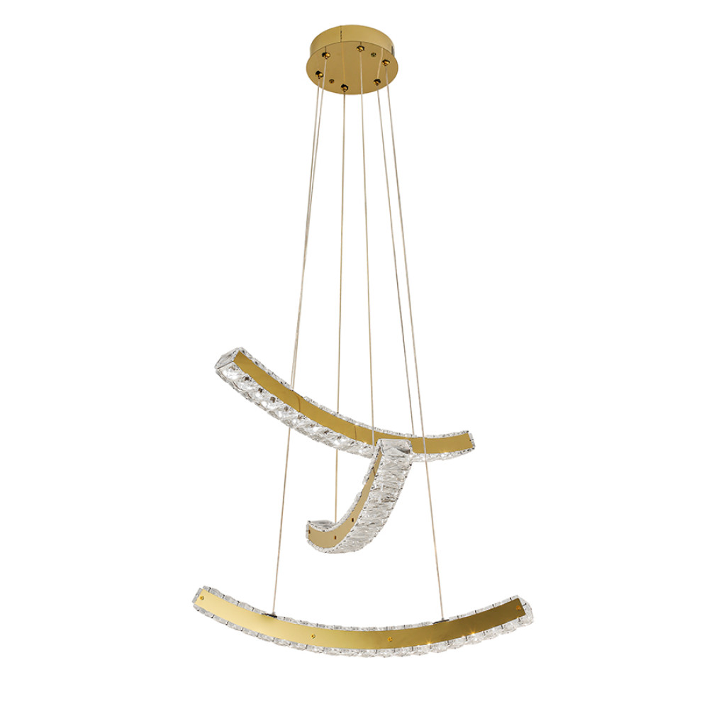 Сучасна декоративна підвісна LED люстра на три джерела світла з регулюванням колірної температури та пультом управління. Незвичайний дизайн люстри представлений у вигляді трьох світлодіодних планок дугоподібної форми. Конструкція планок складається з основи золотого кольору, на яку кріпляться декоративні прямокутні скляні камінці, що м'яко розсіюють світло і створюють розкішний блискучий ефект.