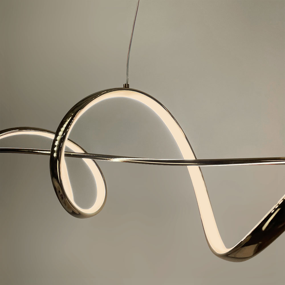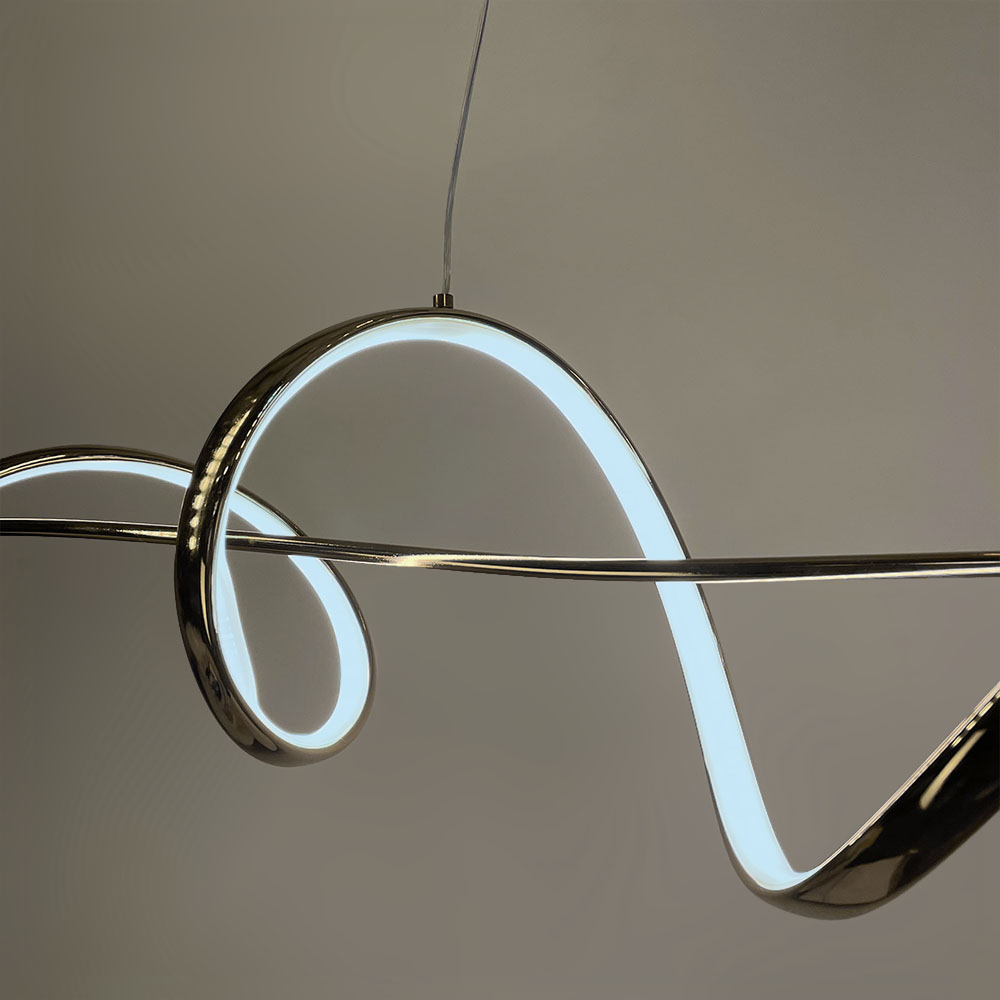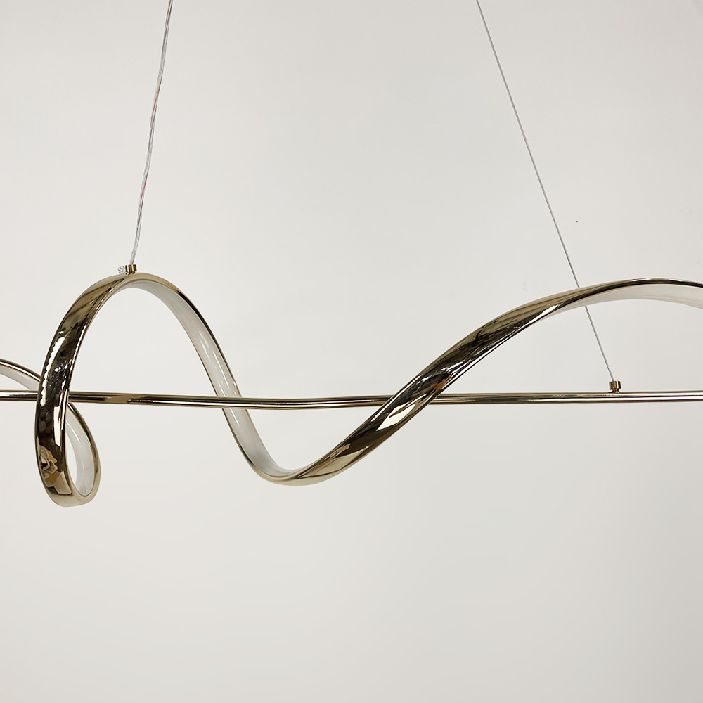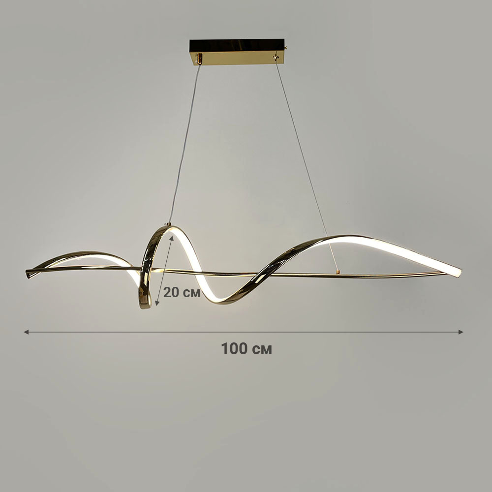 Потужність, 100 см - 42 Вт (21 Вт тепле та холодне світло) Ця LED люстра в елегантному золотому корпусі стане стильним акцентом у сучасному інтер'єрі. Завдяки своїй хвилястій формі вона створює динамічний та вишуканий вигляд, який привертає увагу. Ця модель ідеально підходить для різних приміщень, таких як вітальня, спальня або їдальня.
