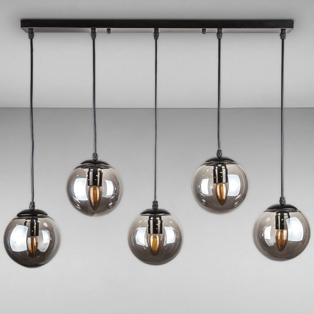 Декоративна підвісна люстра на п'ять ламп з плафонами у формі сфери.