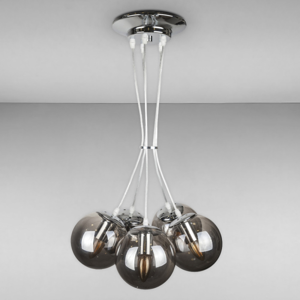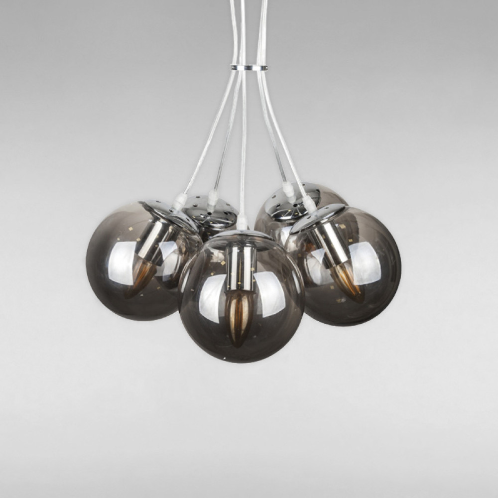 Декоративна підвісна люстра на п'ять ламп з плафонами у формі сфери.