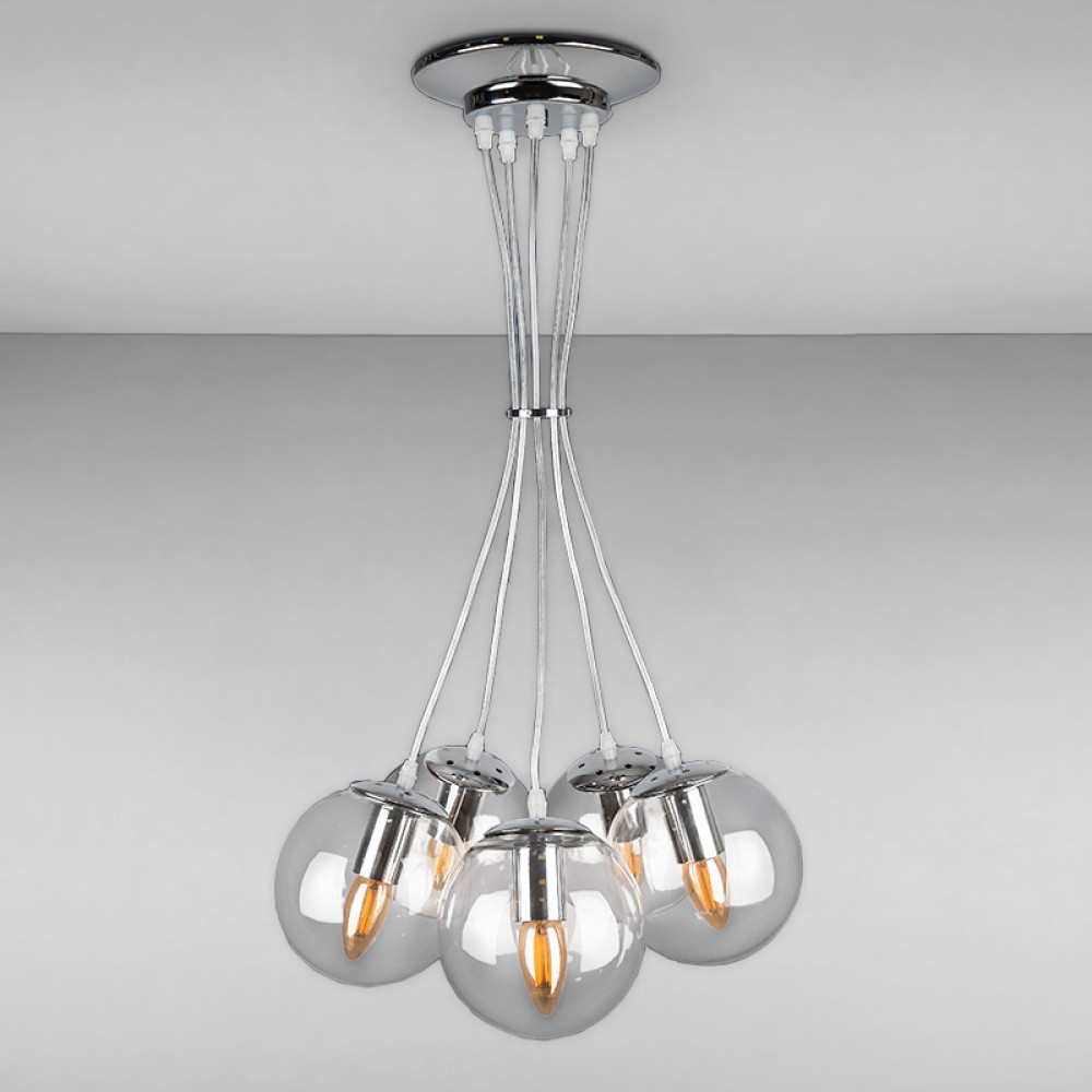 Декоративна підвісна люстра на п'ять ламп з плафонами у формі сфери.